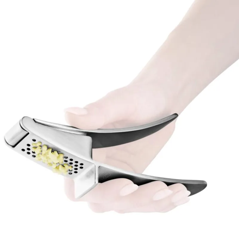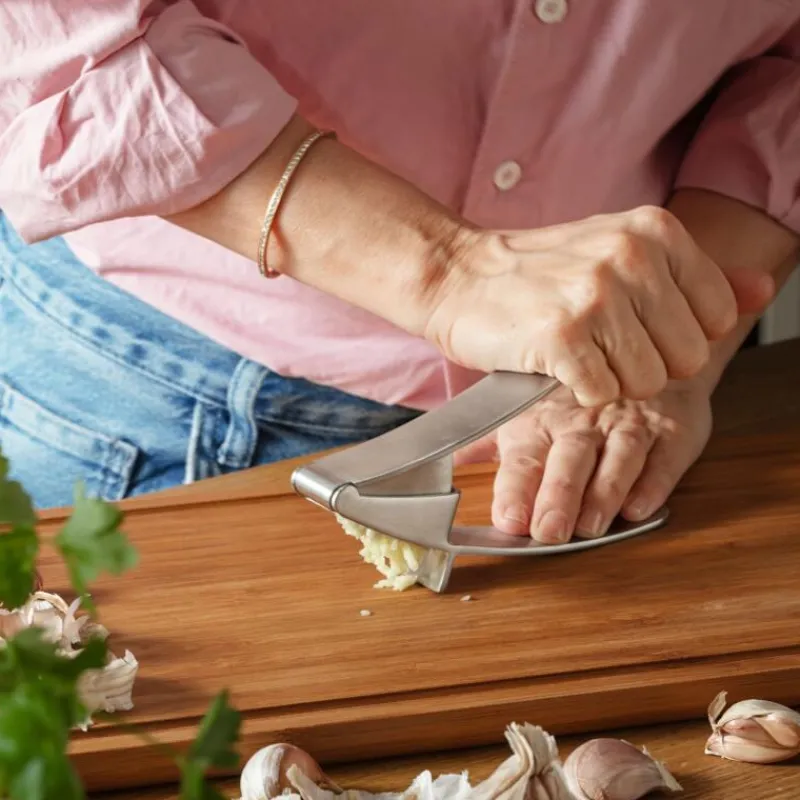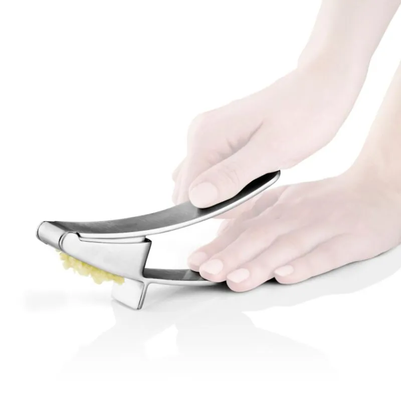 Um frischen Knoblauch schnell und mühelos zu pressen bietet sich die Knoblauchpresse aus Edelstahl von Eva Solo an. Sie ermöglicht es, den Knoblauch entweder wie gewohnt mit der Hand zu pressen, die Presse kann aber auch auf die Arbeitsplatte gelegt und so das eigene Körpergewicht genutzt werden, um den nötigen Druck auszuüben. Der ergonomische Griff ist komfortabel in der Nutzung und sorgt für eine gleichmäßige Kraftverteilung, sodass Kraft gespart wird. Die Knoblauchpresse ist 16 cm lang und kann in der Spülmaschine gereinigt werden.