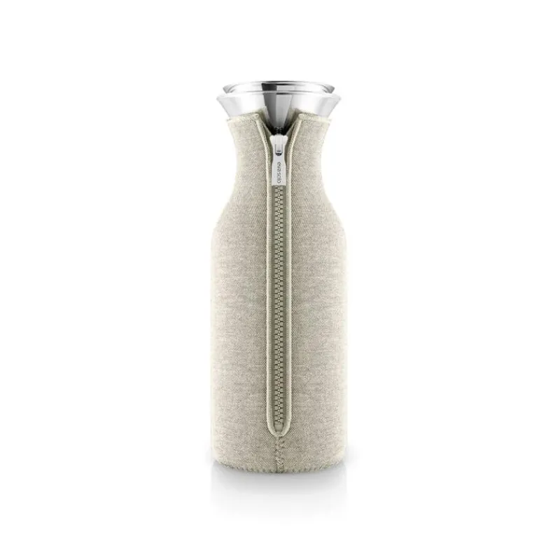 Die Kühlschrankkaraffe des dänischen Design Labels Eva Solo hat sich längst zu einem Klassiker entwickelt. Kein Wunder, denn sie vereint einzigartige Funktionalität mit klaren Linien und einem schönen Design. Die Form der Glasflasche ist an eine traditionelle Milchflasche angelehnt und passt so bequem in übliche Kühlschranktüren. Die Karaffenöffnung ist ausreichend groß, um problemlos Eiswürfel, Zitronenspalten, Gurkenscheiben, Erdbeeren oder Minzeblätter einzufüllen. Die Kühlschrankkaraffe ist ein Teil der preisgekrönten Eva Solo Serie von tropffreien Kannen und Karaffen, die garantiert keine Flecken oder Wasserränder auf dem Tisch hinterlassen. Mit dem patentierten Edelstahl-Ausgießer kann leicht eingegossen werden, ohne daneben zu tropfen oder zu kleckern. Der Flip-Top-Deckel öffnet sich automatisch beim Einschenken, und verschließt sich wieder, wenn die Karaffe auf dem Tisch steht. Der Anzug der Karaffe hält den Inhalt je nach Bedarf heiß oder kalt und verhindert Kondenswasserflecken auf dem Tisch. Karaffe und Flip-Top-Deckel sind spülmaschinengeeignet. Der Anzug kann im Schonwaschgang bei 30 Grad in der Maschine gewaschen werden. Die Karaffe hat ein Fassungsvermögen von 1000 ml. Der Anzug hat eine Innenseite aus Neopren und eine Außenseite aus einem eleganten Strukturstoff, der perfekt zu einem modernen und minimalistischen Einrichtungsstil passt. Der Anzug hat die Farbe Coconut.