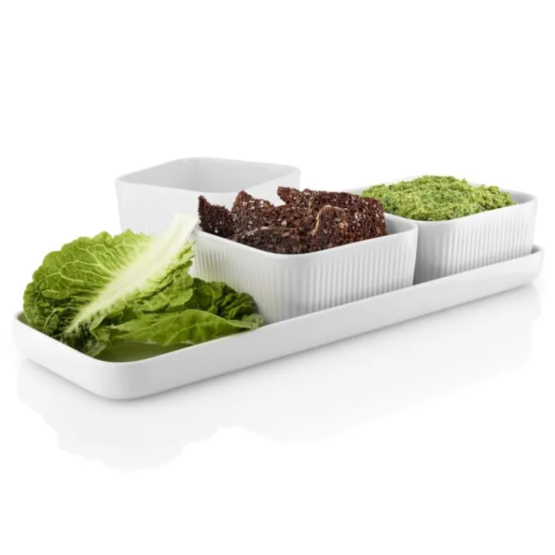 Vielseitig, praktisch und elegant – so lässt sich das Tapas-Set aus der Serie Legio Nova von Eva Solo beschreiben. Es bietet zahlreiche Möglichkeiten, leckere Kleinigkeiten, Desserts und Snacks zu servieren. Nach dem Einsatz lässt es sich platzsparend verstauen. Natürlich lassen sich die Teile auch einzeln verwenden. Das Set besteht aus einer Porzellanplatte mit den Maßen 13 x 37 cm sowie drei passenden Schälchen.