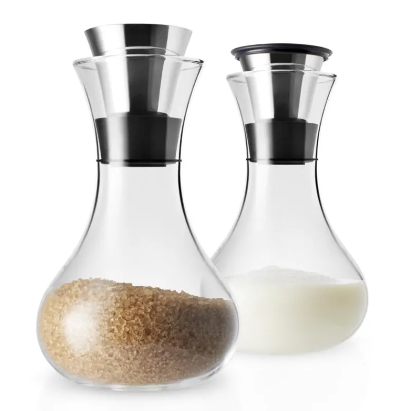 Mit dem Zucker- und Sahne-Set von Eva Solo wird der Nachmittagskaffee oder -tee zu einem ästhetischen Erlebnis. Die Behälter aus hitzebeständigem Glas, das hohe Temperaturen im Geschirrspüler oder Mikrowellenherd verträgt, sind kleine Varianten des Kaffee- oder Teebereiters von Eva Solo. Wird der Einsatz mit tropffreiem Rand abgenommen, kann das Sahnekännchen in die Mikrowelle gestellt werden, um Milch für schäumende Kaffeegetränke wie Café Latte oder Cappuccino zu erhitzen. Sollte nicht alles verbraucht werden, kann die Kanne mit dem enthalten Gummideckel verschlossen und in den Kühlschrank gestellt werden, so dass die Milch nicht den Geschmack anderer Lebensmittel annehmen kann. Der praktische Einsatz des Zuckerbehälters gibt automatisch die einem Teelöffel entsprechende Menge frei, wenn er auf den Kopf gedreht wird, so dass sich der Zucker einfach dosieren lässt. Die Behälter fassen jeweils ein Volumen von 250 ml und sind 15 cm hoch.