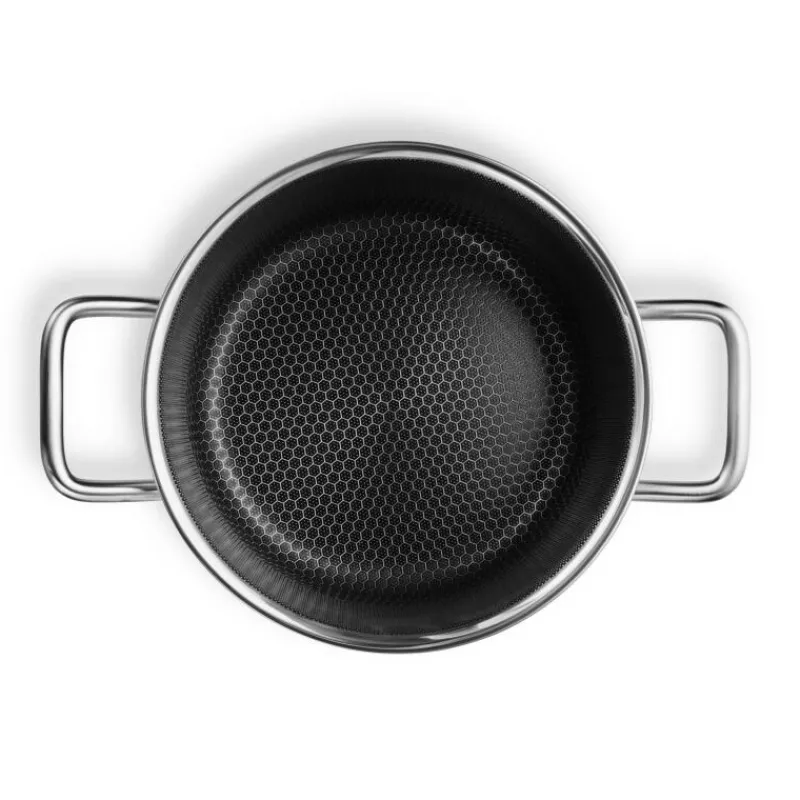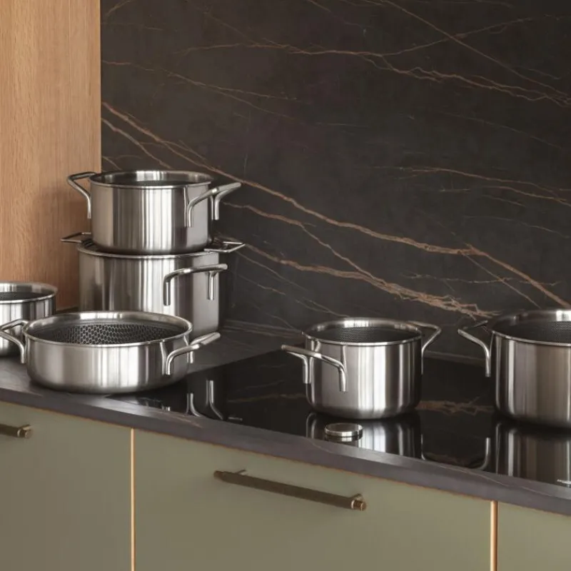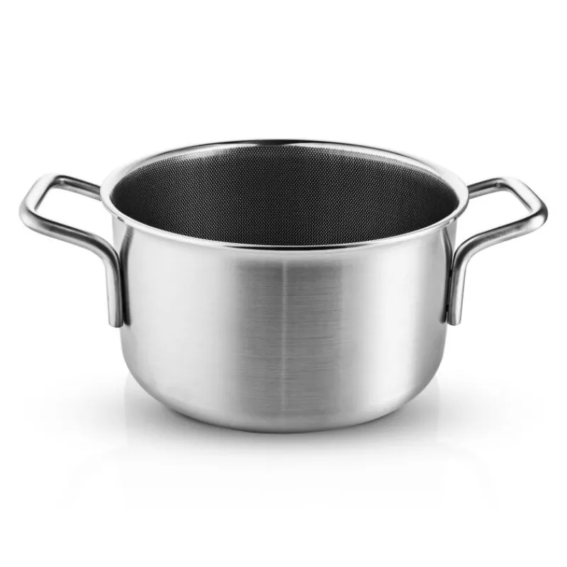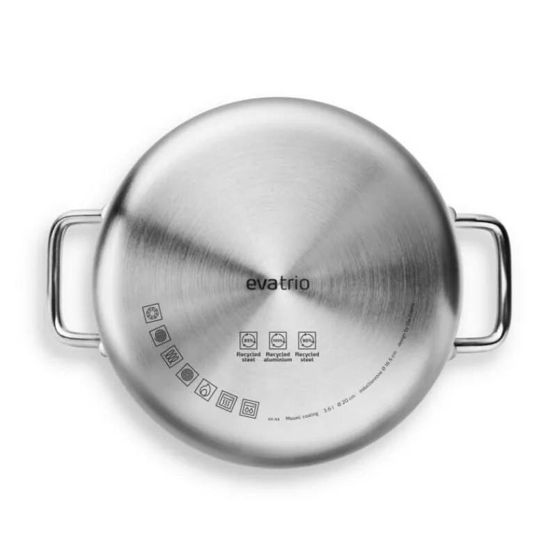 Dieser Kochtopf kombiniert die bekannten Designmerkmale und die Qualität von Eva Trio mit Verbesserungen und Materialien der nächsten Generation. Die Innenseite weist eine markante Beschichtung auf, die oben aus Edelstahl und unten aus einer keramischen Antihaftbeschichtung besteht. Mit dieser Kombination wird das Risiko reduziert, dass Zutaten ankleben oder anbrennen. Gleichzeitig ist die Beschichtung so robust, dass Sie Metallutensilien verwenden können, ohne sie zu beschädigen. Der Kochtopf hat einen Körper, der aus 90 % recyceltem Edelstahl und 100 % recyceltem Aluminium gefertigt ist. Das einzigartige mehrschichtige Sandwich-Design ermöglicht ein schnelles Aufheizen, eine gleichmäßige Wärmeverteilung und sorgt für eine robuste, verschleißfeste Außenseite. Der Topf hält Temperaturen von bis zu 400 °C im Ofen aus und ist mit allen Wärmequellen, einschließlich Induktion, kompatibel. Er kann einfach in der Spülmaschine oder mit einem Stahlschwamm gereinigt werden. Er hat ein Volumen von 3,6 Litern und einen Durchmesser von 20 cm.