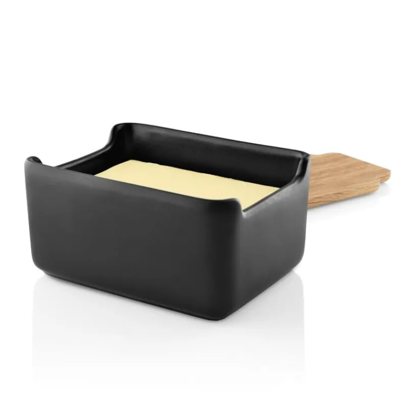 Mit der Butterdose aus der Serie Nordic Kitchen von Eva Solo haben Sie nie wieder fettige Butterverpackungen im Kühlschrank! In der schlichten Dose aus schwarzem Steinzeug und geöltem Eichenholz lässt sich die Butter sauber und hygienisch aufbewahren. Eine Standardpackung Butter passt hinein, die Dose kann auch mit Süßigkeiten oder anderen Snacks befüllt werden. Die Schale ist spülmaschinengeeignet, der Deckel muss jedoch von Hand gespült werden.