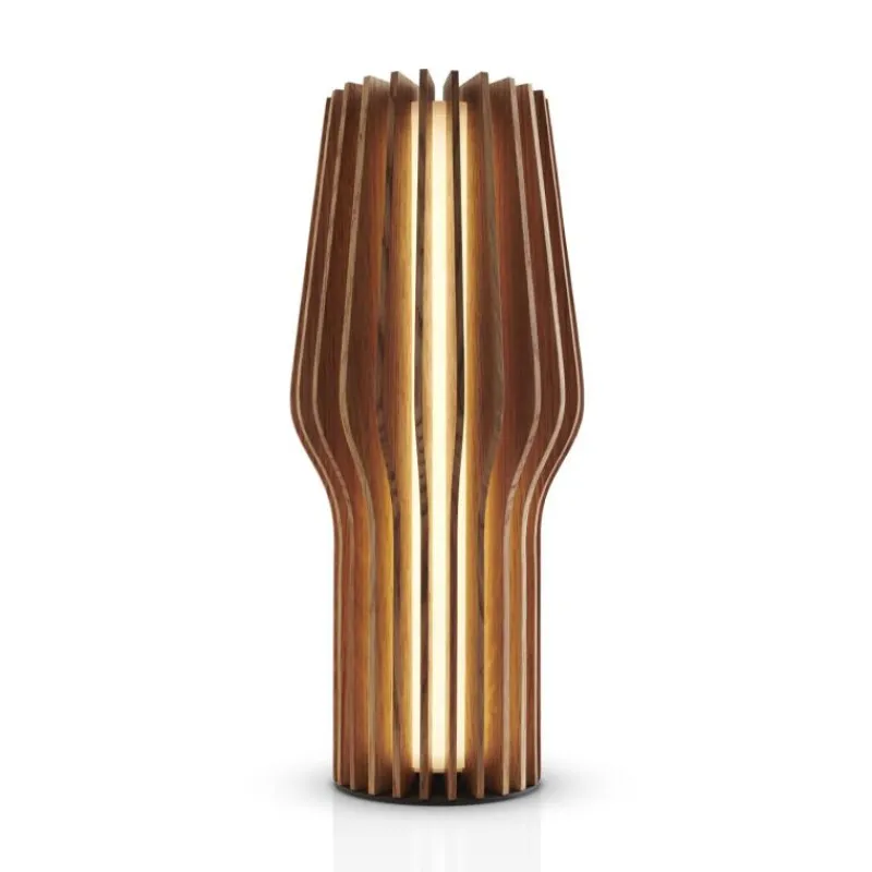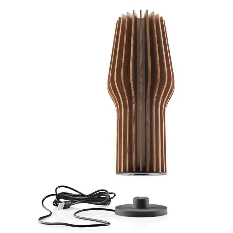Die kabellose LED-Leuchte Radiant aus Eichenholz von Eva Solo schafft sowohl im Wohnbereich, als auch auf der Terrasse oder dem Balkon eine gemütliche Atmosphäre. Drei verschiedene Lichtstärken ermöglichen eine individuelle Beleuchtung, diese lassen sich mit der Touch-Funktion an der Oberseite der Leuchte bedienen. Die Lampe lässt sich mit auf der mitgelieferten Basis über USB aufladen, eine Ladung reicht bei voller Lichtstärke bis zu sechs Stunden. Die Lamellen der Tischlampe bestehen aus Eichenholz, die Lampe ist 28,5 cm hoch und hat einen Durchmesser von 9,5 cm.