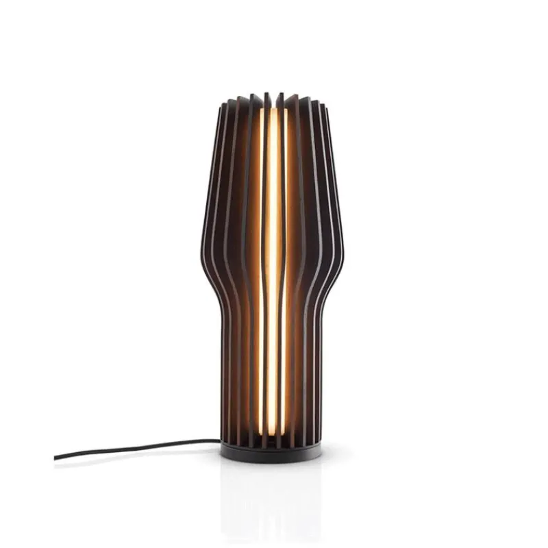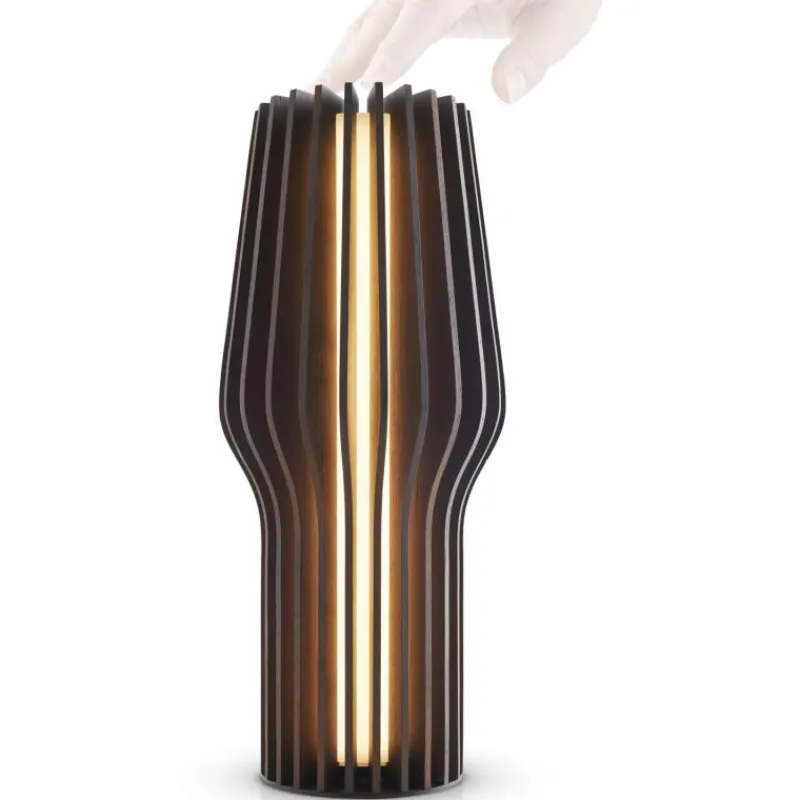 Die kabellose LED-Leuchte Radiant aus geräuchertem Eichenholz von Eva Solo schafft sowohl im Wohnbereich, als auch auf der Terrasse oder dem Balkon eine gemütliche Atmosphäre. Drei verschiedene Lichtstärken ermöglichen eine individuelle Beleuchtung, diese lassen sich mit der Touch-Funktion an der Oberseite der Leuchte bedienen. Die Lampe lässt sich mit auf der mitgelieferten Basis über USB aufladen, eine Ladung reicht bei voller Lichtstärke bis zu sechs Stunden. Die Lamellen der Tischlampe bestehen aus Eichenholz, die Lampe ist 28,5 cm hoch und hat einen Durchmesser von 9,5 cm.