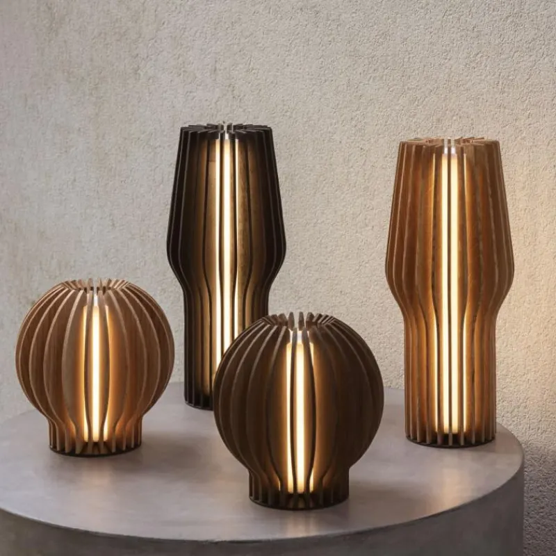 Die kabellose LED-Leuchte Radiant aus geräuchertem Eichenholz von Eva Solo schafft sowohl im Wohnbereich, als auch auf der Terrasse oder dem Balkon eine gemütliche Atmosphäre. Drei verschiedene Lichtstärken ermöglichen eine individuelle Beleuchtung, diese lassen sich mit der Touch-Funktion an der Oberseite der Leuchte bedienen. Die Lampe lässt sich mit auf der mitgelieferten Basis über USB aufladen, eine Ladung reicht bei voller Lichtstärke bis zu sechs Stunden. Die Lamellen der Tischlampe bestehen aus Eichenholz, die Lampe ist 28,5 cm hoch und hat einen Durchmesser von 9,5 cm.