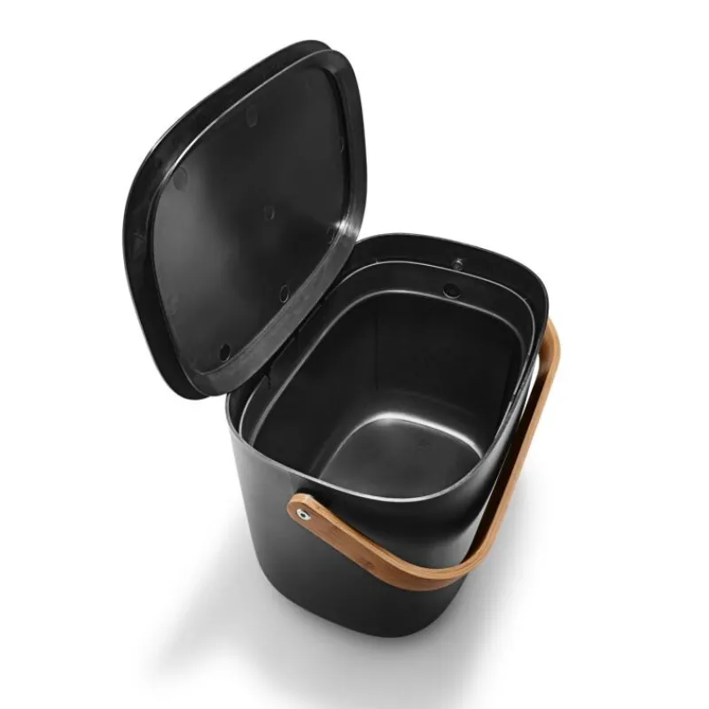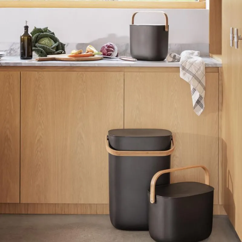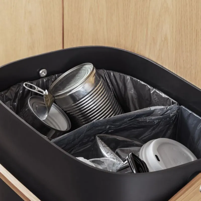 Der Abfallbehälter für zwei Müllbeutel der Serie Reflect ist eine ästhetische und praktische Lösung für die Mülltrennung, die sich dank des integrierten Griffs leicht transportieren lässt. Der Behälter ist aus umweltfreundlichen Materialien wie recyceltem Kunststoff und Bambusholz gefertigt, für den Gebrauch sind keine speziellen Müllbeutel erforderlich, da sich der verstellbare Beutelhalter mit unterschiedlichen Beutelgrößen verwenden lässt. Auch entfällt das lästige Offenhalten des Deckels bei der Abfallentsorgung, da der Deckel automatisch greift und auf dem Rand des Behälters balanciert. Zudem ist der Abfallbehälter leicht zu reinigen und kann mit einem feuchten Tuch ausgewischt werden. In der mittelgroßen Variante hat der Reflect Abfallsortierbehälter ein Volumen von 16 Litern, er ist 26 cm hoch, 38 cm breit und 25,5 cm lang.
