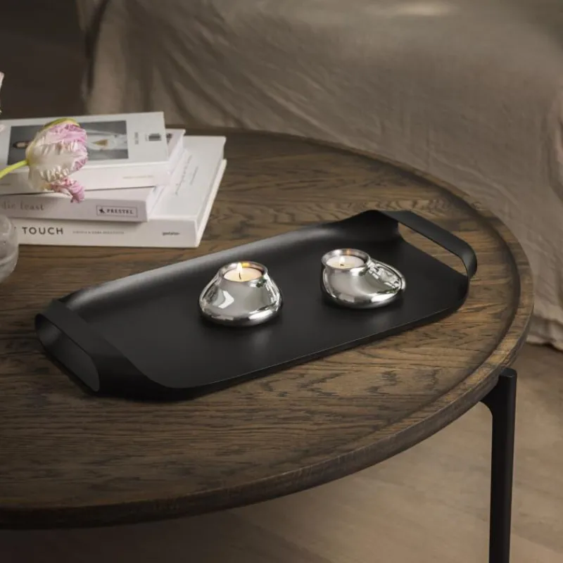 Das elegante Serviertablett wird ohne sichtbaren Fugen aus einem einzigen Stück Stahl geformt und erhältso ein glattes, kantenloses Aussehen. Durch die niedrig platzierten Griffe wird die Stabilität und Balance beim Tragen erhöht, für zusätzliche Sicherheit ist auch eine passende, rutschfeste Silikonmatte erhältlich. Dank des flachen Designs lässt sich das Tablett nach Gebrauch mühelos verstauen. Es eignet sich nicht nur zum Servieren von Mahlzeiten und Drinks, sondern ist gleichzeitig auch ein stilvolles Einrichtungsobjekt, was mit Kerzenhaltern oder kleinen Vasen bestückt werden kann. Das Tablett ist 44 cm breit und 25 cm tief.