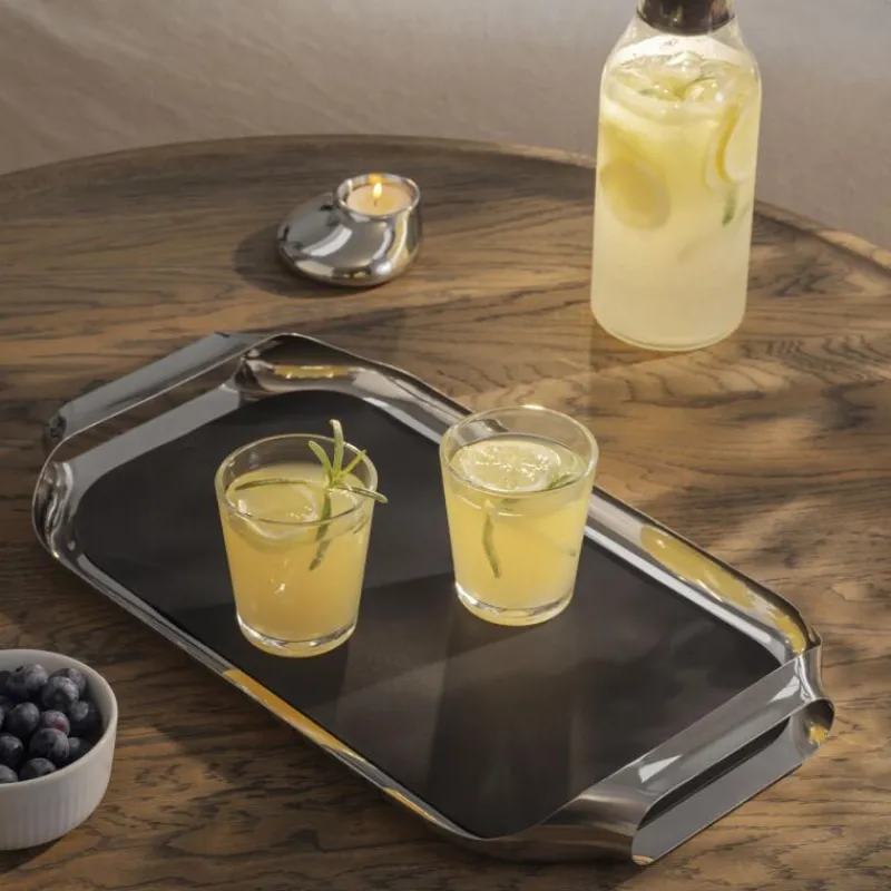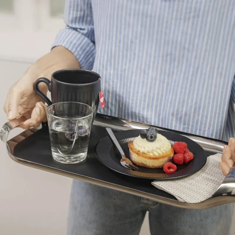 Das elegante Serviertablett wird ohne sichtbaren Fugen aus einem einzigen Stück Edelstahl geformt und erhältso ein glattes, kantenloses Aussehen. Für zusätzliche Sicherheit beim Tragen ist diese passende, rutschfeste Silikonmatte erhältlich. So können nicht nur Mahlzeiten und Drinksserviert werden, sondern ergänzt das Tablett gleichzeitig zu einem stilvolles Einrichtungsobjekt, was mit Kerzenhaltern oder kleinen Vasen bestückt werden kann. Die Silikonmatte ist 40 cm breit und 21 cm tief.