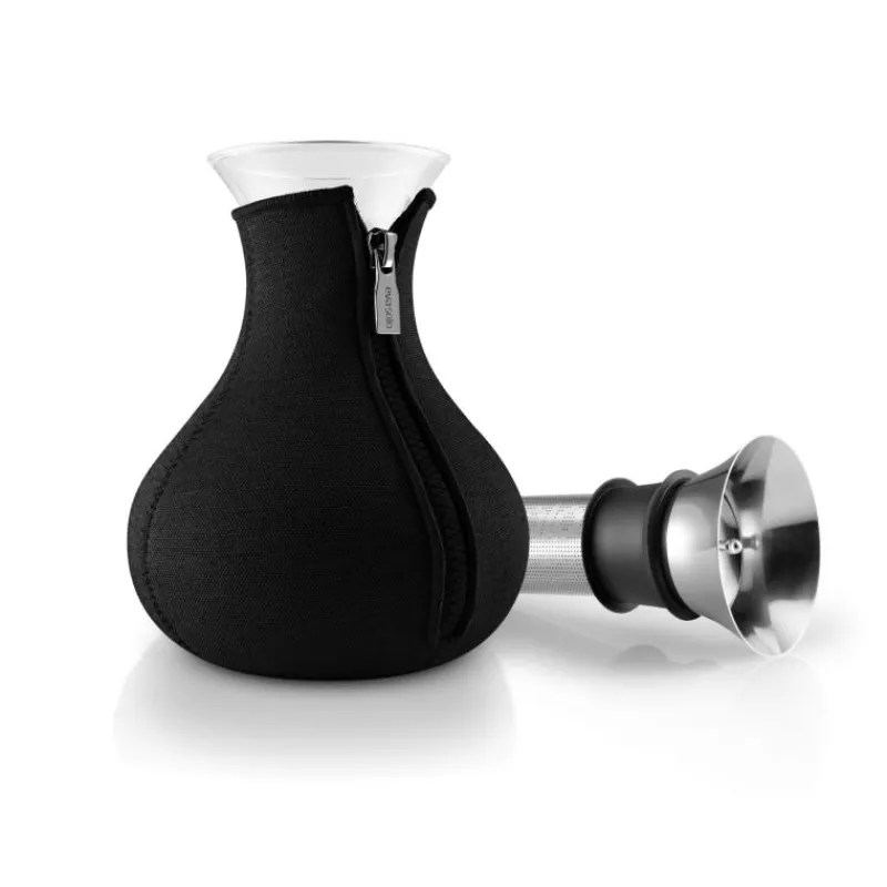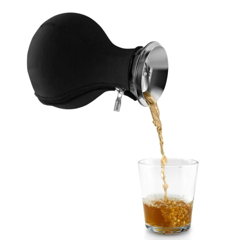 Der Teebereiter des dänischen Design Labels Eva Solo hat eine hübsche, bauchige Form und ist mit einem isolierenden Anzug aus Neopren ummantelt, um den Tee heiß zu halten. Der Glaskolben besteht aus hitzebeständigem, gehärteten Glas. Dank seines Gieß-Einsatzes ist der Teebereiter zu 100 % tropffrei. Im patentierten Flip-Top-Deckel sind darüber hinaus ein Filtertrichter und ein Kolben integriert, der hinuntergedrückt wird, sobald der Tee fertig ist. Der Filter kann somit in der Kanne verbleiben, ohne dass der Tee weiter zieht. So ist Schluss mit Schalen für tropfende Teefilter oder Teebeutel und mit Flecken auf dem Tisch. Der Teezubereiter von Eva Solo ist unkompliziert und praktisch. Ein schlicht designtes, äußerst funktionales Produkt, das aus vielen Haushalten nicht mehr wegzudenken ist. Der Teebereiter fasst 1000 ml und ist spülmaschinengeeignet. Der Anzug hat eine Innenseite aus Neopren und eine Außenseite aus einem eleganten Strukturstoff, der perfekt zu einem modernen und minimalistischen Einrichtungsstil passt. Der Anzug hat die Farbe Black Woven.