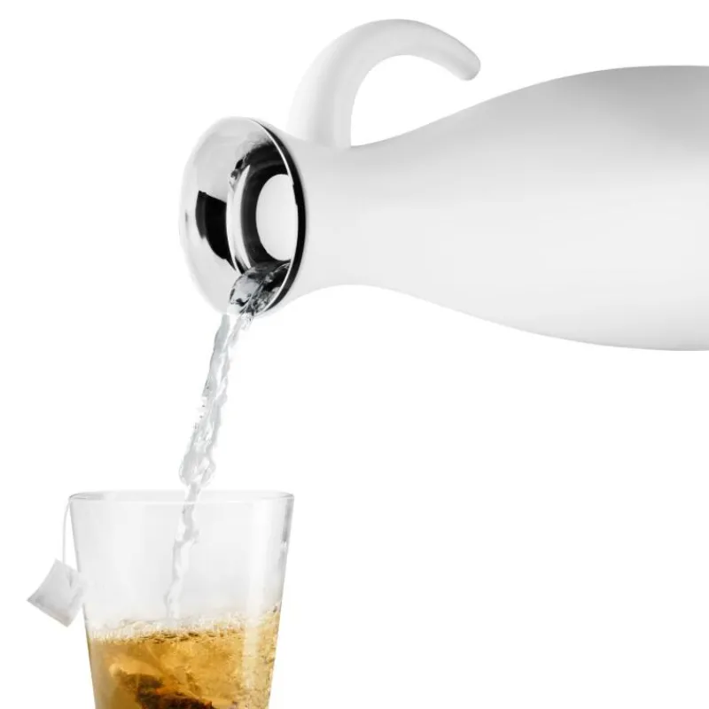 Der Wasserkocher des dänischen Design Labels Eva Solo ist nicht nur schön, sondern auch praktisch und funktional. Optisch ist er in den gleichen organisch weichen Formen wie die beliebten Isolierkannen von Eva Solo gehalten. Er ist ein echter Blickfang und muss nicht in die Küche verbannt werden, sondern ziert auch Tafel und Wohnzimmer. Der Wasserkocher ist mit dem patentierten und absolut tropffreien Ausgießer von Eva Solo ausgestattet, mit dem man keine Flecken hinterlässt. Der Deckel ist in den Wasserkocher integriert und ist somit nicht im Weg, wenn Wasser eingeschenkt wird. Man füllt das Wasser direkt durch den Deckel ein und gießt es auch wieder aus, ohne ihn abnehmen zu müssen. Darüber hinaus ist der Wasserkocher um 360° drehbar und kabellos. Der mattweiße Wasserkocher hat eine automatische Abschaltung und eine Füllstandsanzeige. Er hat ein Fassungsvermögen von 1500 ml und ist bei einem Durchmesser von 17,5 cm etwa 33,5 cm hoch.