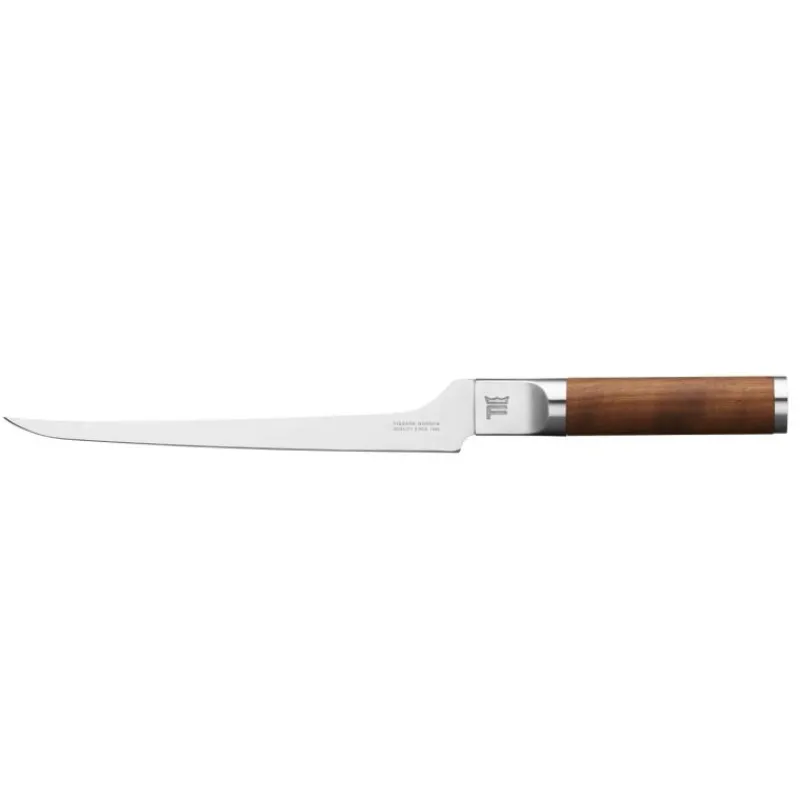 Alle Messer der Serie Norden werden aus hochwertigen Materialien gefertigt: die Klingen bestehen aus deutschem Karbonstahl, der hervorragende Leistung und langanhaltende Schärfe garantiert. Diese überragende Schneidleistung kann durch regelmäßiges Schleifen im Winkel von 26 Grad gehalten werden. Wahre Handschmeichler sind die Griffe aus wärmebehandeltem, finnischen Birkenholz, der natürliche Maserung zur Einzigartigkeit des Messers beiträgt. Das Filetiermesser der Kollektion Norden ist mit seiner langen, flexiblen Klinge ideal zum Filetieren von Fleisch und Fisch. Wie alle hochwertigen Kochmesser sollte es nur von Hand gespült werden. Die Klingenlänge des Filetiermessers beträgt 21 cm, insgesamt ist es 31,5 cm lang.