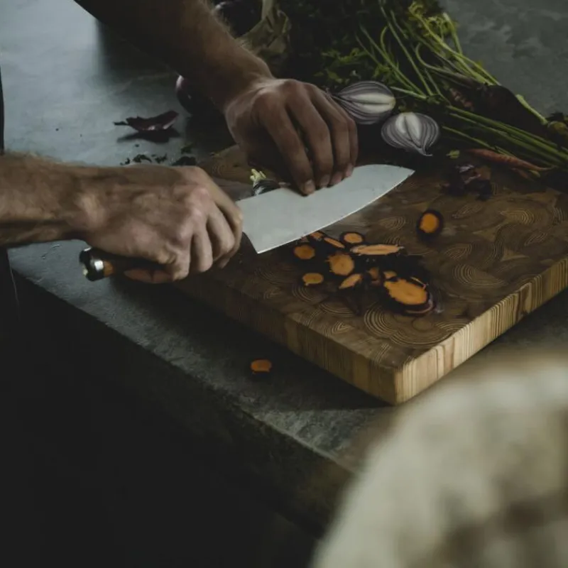 Alle Messer der Serie Norden werden aus hochwertigen Materialien gefertigt: die Klingen bestehen aus deutschem Karbonstahl, der hervorragende Leistung und langanhaltende Schärfe garantiert. Diese überragende Schneidleistung kann durch regelmäßiges Schleifen im Winkel von 26 Grad gehalten werden. Wahre Handschmeichler sind die Griffe aus wärmebehandeltem, finnischen Birkenholz, der natürliche Maserung zur Einzigartigkeit des Messers beiträgt. Das große Kochmesser der Kollektion Norden ist ein handliches Allzweckmesser für Schneidaufgaben aller Art, besonders für Gemüse. Wie alle hochwertigen Kochmesser sollte es nur von Hand gespült werden. Die Klingenlänge des großen Kochmessers beträgt 21 cm, insgesamt ist es 31,5 cm lang.
