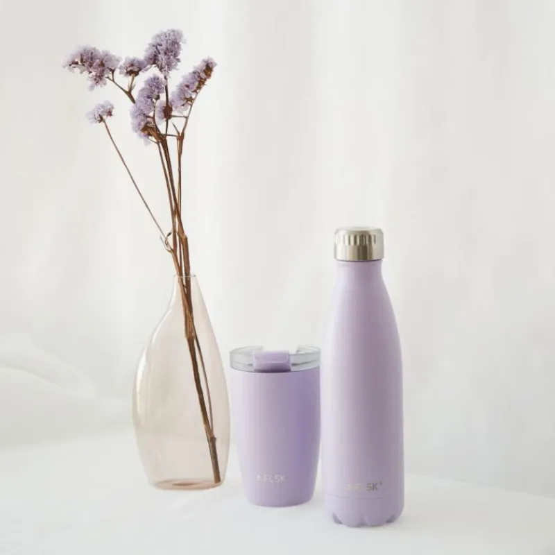 Die Trinkflasche in der Farbe neuen Frühlingsfarbe Lavender kommt mit ihrem zartem fliederfarbenem Powdercoating edel und doch modern puristisch daher. Die innovative Beschichtung besteht dabei aus zwei Bestandteilen, einer Vakuumschicht zwischen zwei Edelstahlwänden sowie einer Kupferbeschichtung an der Außenseite. Egal ob Wasser oder Wein, die optimale Trinktemperatur bleibt mindestens 24 Stunden konstant kalt ebenso wie der Kaffee oder Tee bis zu 18 Stunden schön heiß bleibt. Egal ob zu Hause oder unterwegs, die FLSK ist immer eine treue und absolut dicht haltende Begleitung. Sie ist insgesamt 25,5 cm hoch und hat nur ein geringes Gewicht von 320 Gramm. Gefertigt wird sie aus Edelstahl.