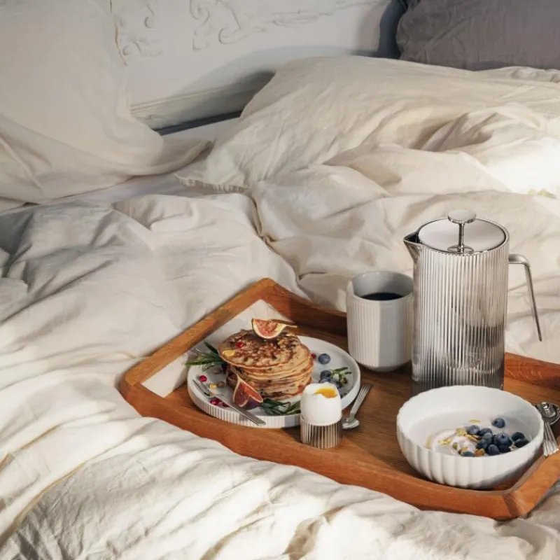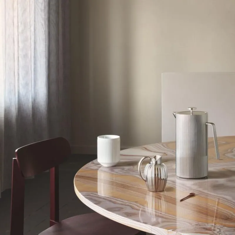 Das Design der Bernadotte French-Press-Kanne von Georg Jensen ist an die frühen Entwürfe von Sigvard Bernadotte angelehnt, der nicht nur als einer der ersten Designer mit Jensen zusammenarbeitete, sondern auch ein Prinz des dänischen Königshauses war. Die Kollektion ist ein beispielhaftes Zusammenspiel aus skandinavischem Minimalismus und von der Art Déco inspirierten Modernität. Die doppelwandige Isolierkanne besteht aus glänzendem Edelstahl und weist das für die Bernadotte-Serie klassische Rillenmuster auf. Sie hat ein Volumen von einem Liter und ist 22,2 cm hoch.