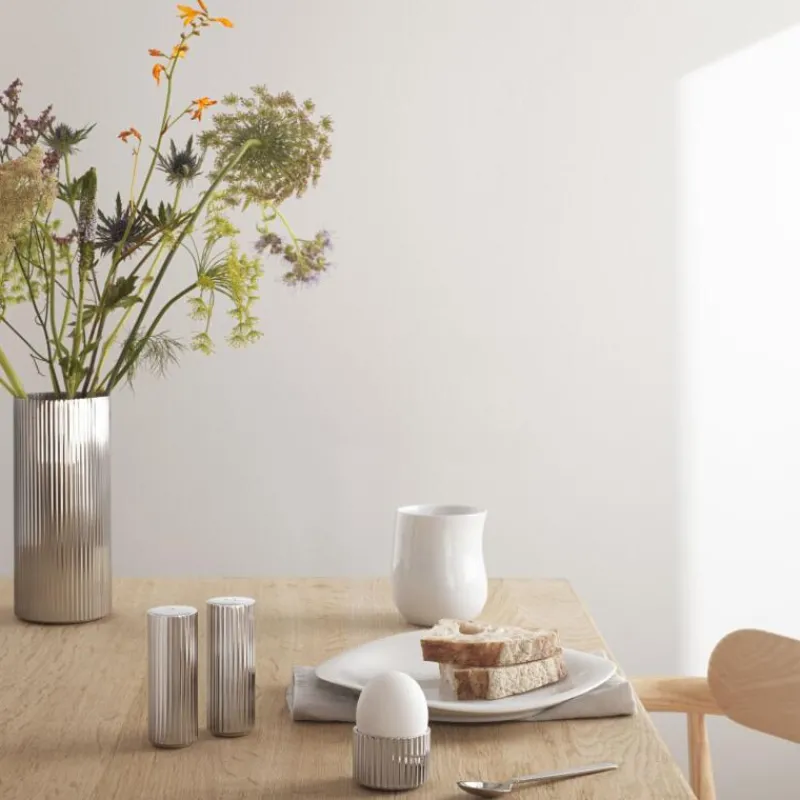 Das Design der Bernadotte Salz- und Pfefferstreuer von Georg Jensen ist an die frühen Entwürfe von Sigvard Bernadotte angelehnt, der nicht nur als einer der ersten Designer mit Jensen zusammenarbeitete, sondern auch ein Prinz des dänischen Königshauses war. Die Kollektion ist ein beispielhaftes Zusammenspiel aus skandinavischem Minimalismus und von der Art Déco inspirierten Modernität. Die kleinen Gewürzstreuer besteht aus hochglanzpoliertem Edelstahl und weisen das für die Bernadotte-Serie klassische Rillenmuster auf. Sie verleihen Ihrer Tafel eine zeitlose Eleganz und verkörpern perfekt den Qualitätsanspruch von Georg Jensen. Die Streuer sind jeweils 8,8 cm hoch und haben einen Durchmesser von 3,1 cm.