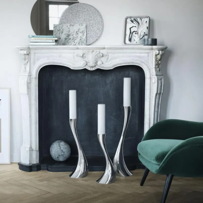 Die auffälligen organischen Formen der Kerzenhalter verleihen jeder Tischdekoration einen dynamischen Touch. Der Eindruck von Bewegung und die Verbindung von Design und Funktion sind nach wie vor präsent. Der elegante, silberne Schimmer macht diese Stücke zu einer augenfälligen Ergänzung für jede Dekoration. Bitte beachten Sie, dass die Kerzen (3586472) separat erhältlich sind. Der kleine Bodenkerzenleuchter ist 40 cm hoch.