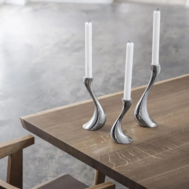 Seit seiner Markteinführung 2008 war die Cobra-Linie ein durchschlagender Erfolg. Nimmt man Cobra in die Hand, fallen sofort seine Glätte und sein Gewicht auf. Designer Constantin Wortmann hatte sich das Ziel gesetzt, einen traditionellen Kerzenhalter zu entwerfen, der modernen Ansprüchen genügt. Obschon er aufgrund seines bedeutenden Gewichts und seiner Höhe an einen antiken Kerzenleuchter erinnert, ist er mit seinen Vorfahren in Bezug auf seine üppigen, der Schwerkraft widerstehenden Kurven, dargestellt in spiegelpoliertem Edelstahl, nicht zu vergleichen. Wie die mystische Schlange, von der sie sich haben inspirieren lassen, kann man seinen Blick nur schwer von den Cobra Kerzenhaltern abwenden, insbesondere wenn man sie in Zweier- oder Dreiergruppen arrangiert. Die unwiderstehlichen Kerzenhalter sind in drei unterschiedlichen Größen erhältlich, so dass Sie Ihren Tisch oder Ihren Kaminsims in ein fesselndes Tableau verwandeln können.