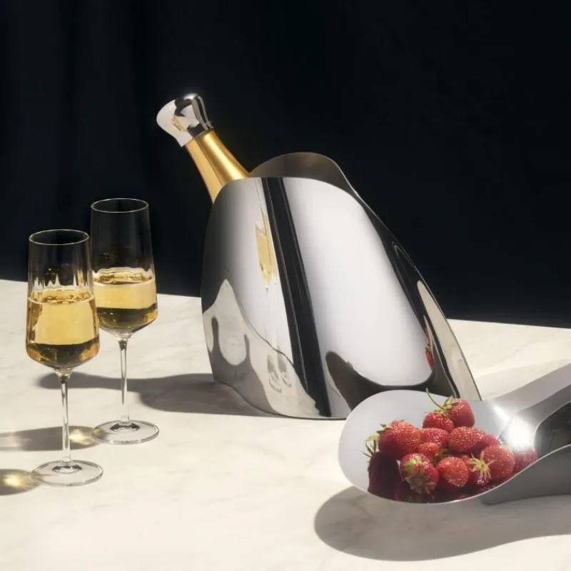 Der Champagnerkühler ist aus poliertem Edelstahl gefertigt und sieht auf einem Esstisch oder Buffet einfach gut aus. Seine geschwungenen Formen in Kombination mit der hochwertigen Oberflächengestaltung verleihen ihm wie allen glanzvollen Stücken der Indulgence-Kollektion eine ganz individuelle Hochwertigkeit. Er ist 22,5 cm hoch und 28 cm lang.