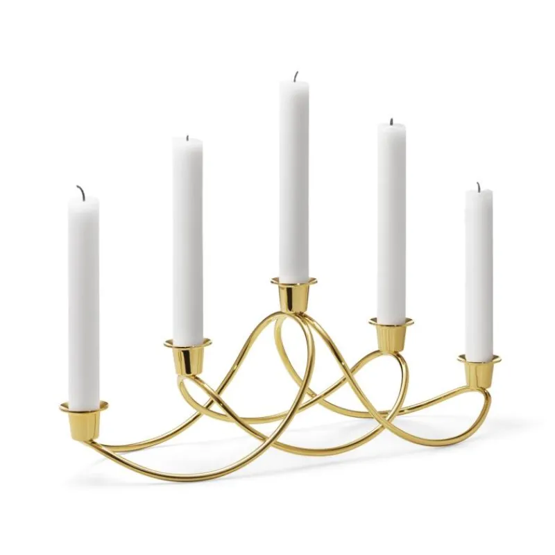Der Kerzenhalter Harmony im Design von Maria Berntsen für Georg Jensen bietet Platz für fünf Stabkerzen und schafft eine festliche und gemütliche Atmosphäre. Mit seiner schmalen, länglichen Form findet er auch auf gedeckten Tafeln oder auf der Fensterbank Platz und kann Jahr für Jahr seinen dekorativen Glanz verströmen. Der Kerzenhalter besteht aus Edelstahl, das mit einer 18-karätigen Goldauflage versehen ist. So wirkt der Kerzenschein besonders warm und feierlich. Der Kerzenhalter Harmony ist 14,3 cm hoch und 41,9 cm lang.