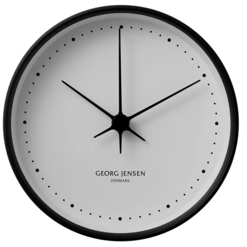 Das Uhrendesign Koppel war bei seiner Vorstellung im Jahr 1978 revolutionär; heute sind Koppels Designerstücke Klassiker. Die gewöhnlich auf dem Ziffernblatt einer Uhr vorhandenen Zahlen ersetzte er durch schwarze Punkte. Dieses Gestaltungselement findet man auch bei vielen danach folgenden Uhrenkollektionen von Georg Jensen. Es ist ein gutes Beispiel für das Zusammenspiel von Schlichtheit und Qualität, das seit Beginn ein Gütesiegel für Georg Jensen ist. Die schwarze Wanduhr mit dem weißen Ziffernblatt (Maße: 22 cm) ist ein starkes Zusammenspiel von Stil und Funktion.