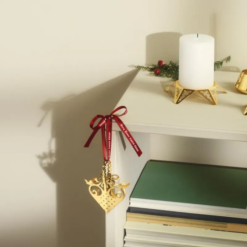 Dieses Weihnachtsmobile ist eine Neu-Auflage der Originals aus dem Jahr 1992. Die Designerin Jette Fröhlich entwarf das mit zwei Vögeln verzierte Herzmotiv, das die Verbundenheit zweier geliebter Menschen darstellen soll. Das Ornament besteht aus Messing mit einer 18-karätigen Goldauflage und wird mit zwei unterschiedlich farbigen Stoffbändern geliefert.