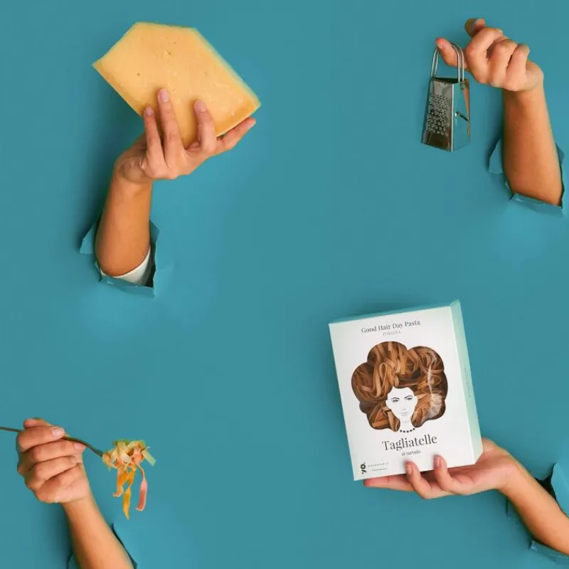 Die leckere und äußerst spektakulär verpackte Pasta Good Hair Day Tagliatelle Al Tartufo von Greenomic wird in Italien in der Region Umbrien nach traditionellem Bronzeverfahren hergestellt. Verfeinert sind sie mit erlesenem Sommertrüffel sowie Steinpilzen aus Italien. Die Verpackung der Pasta spielt humorvoll auf den Bad Hair Day an, den wohl fast jede*r schon erlebt hat. Nicht nur zum selber essen, auch als Geschenk oder Mitbringsel ist diese Pasta perfekt geeignet.
