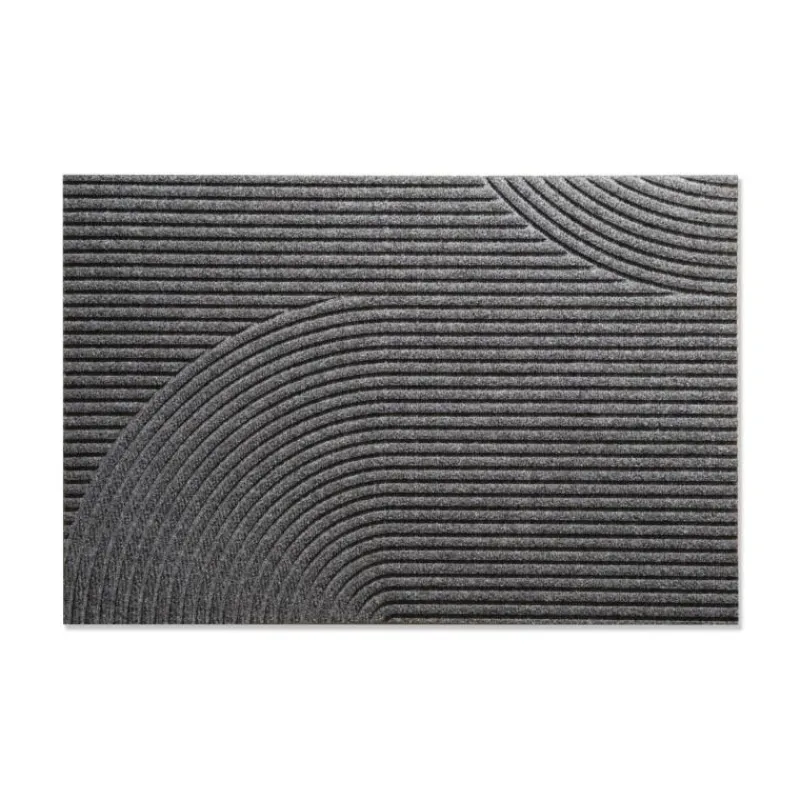 Das sanfte Muster des Mattenmodells Stein erinnert an japanische Zengärten und natürliche Bewegungen in der Natur. Der angenehme Grauton ist für nahezu jede Umgebung passend und fügt sich angenehm ins Gesamtbild ein. So strahlt das von Kristine Five Melvaer designte Modell Ruhe aus und heißt die Gäste im Eingangsbereich in einer ansprechenden Umgebung willkommen. Die Funktionalität steht der Optik der Matte allerdings in nichts nach. Die grobe Oberfläche bietet neben einem guten Abstreifeffekt, eine hohe Absorptionsfähigkeit und gute Schmutzfangeigenschaften. Die gummierte Unterseite sorgt zum einen für einen Anti-Rutsch-Effekt und verhindert darüber hinaus, dass Feuchtigkeit in den Boden einzieht. Die grobe Oberfläche bietet neben einem guten Abstreifeffekt, eine hohe Absorptionsfähigkeit und gute Schmutzfangeigenschaften. Die gummierte Unterseite sorgt zum einen für einen Anti-Rutsch-Effekt und verhindert darüber hinaus, dass Feuchtigkeit in den Boden einzieht. Die Matte ist 60 cm breit, 90 cm lang und etwa 11 mm hoch. Die Matten werden zu einem großen Anteil in Handarbeit hergestellt. Leichte Abweichungen bei der Farbe, Größe und der Optik sind daher möglich. Gefertigt wird die Fußmatte aus einem Textilmaterial, das komplett aus recyceltem Kunststoff besteht. Die Matte benötigt nur wenig Pflege: Im Alltag lässt sie sich mit dem Staubsauger reinigen oder auch abschütteln. Falls eine gründlichere Reinigung nötig sein sollte, kann die Fußmatte mit Wasser abgespült werden.
