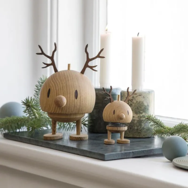 Lachen ist ansteckend. Und die Hoptimisten sorgen, wie der Name schon sagt, hüpfend für gute Laune und ein Lächeln auf Ihren Lippen. Der klassische Hoptimist ist der Inbegriff von Fröhlichkeit, Optimismus und guter Laune und verbreitet mit dem rundlichen, freundlichen Ausdruck Freude, wo auch immer er hüpft. Tippt man dem lustigen Gesellen auf den Kopf, fängt die Feder an zu schwingen und versetzt den Hoptimisten somit in Bewegung. Das Modell Bumble als Weihnachts-Rentier ist mit einem Geweih aus Eichenholz ausgestattet. Die freundlichen Hoptimisten sind heute ein Teil der dänischen Designgeschichte und sorgen weit über die Grenzen Dänemarks hinaus für gute Laune – so natürlich auch zum Weihnachtsfest. Der Artikel wird aus Eichenholz hergestellt und ist 9,5 cm hoch.