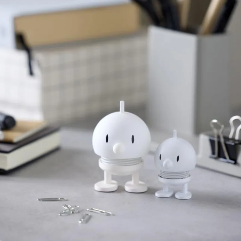 Lachen ist ansteckend! Und die Hoptimisten sorgen, wie der Name schon sagt, hüpfend für gute Laune und ein Lächeln auf Ihren Lippen. Der klassische Hoptimist ist der Inbegriff von Fröhlichkeit, Optimismus und guter Laune und verbreitet mit dem rundlichen, freundlichen Ausdruck Freude, wo auch immer er hüpft. Tippt man dem lustigen Gesellen auf den Kopf, fängt die Feder an zu schwingen und versetzt den Hoptimisten somit in Bewegung. Das Modell Bumble repräsentiert die allerersten Hoptimisten aus der Hand des Designers und soll einen Jungen mit kleiner Antenne auf dem Kopf darstellen. Die freundlichen Hoptimisten sind heute ein Teil der dänischen Designgeschichte und sorgen weit über die Grenzen Dänemarks hinaus für gute Laune. Im Set enhalten sind jeweils ein Bumble in der Größe XS und S mit einer Höhe von 5,8 bzw. 7,6 cm. Beide bestehen aus ABS-Kunststoff und Stahl.