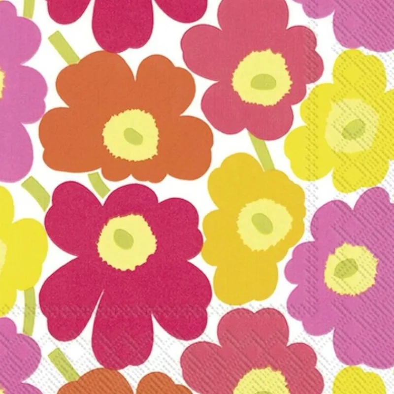 Das Design Unikko (finn. Mohnblume) gehört zu den bekanntesten Entwürfen von Maija Isola. Ihr Entwurf für diesen Druck entstand zu einer Zeit, als es kaum florale Muster in der Kollektion von Marimekko gab. Isola war jedoch so von dem Thema Blumen fasziniert, dass sie eine ganze Reihe neuartiger Drucke mit floralen Designs entwarf. So hat Unikko es mit seinem bunten Blumendruck geschafft, zur weltberühmten Ikone zu werden. Im Päckchen enthalten sind 20 Servietten mit den Maßen 33 x 33 cm. Diese bestehen aus zertifiziertem bzw. recyceltem Tissue-Papier und sind mit lebensmittelechter Farbe auf Wasserbasis bedruckt.