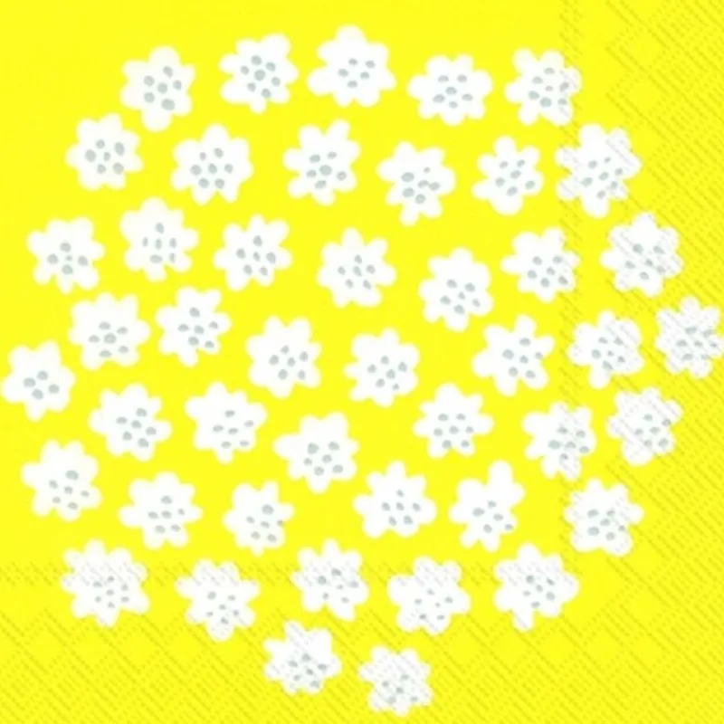 Die Lunch-Servietten Puketti yellow mit Motiv von Marimekko sind 33 x 33 cm groß. Sie bestehen aus gefalztem, dreilagigem Tissuepapier. Ein Päckchen enthält 20 Servietten.