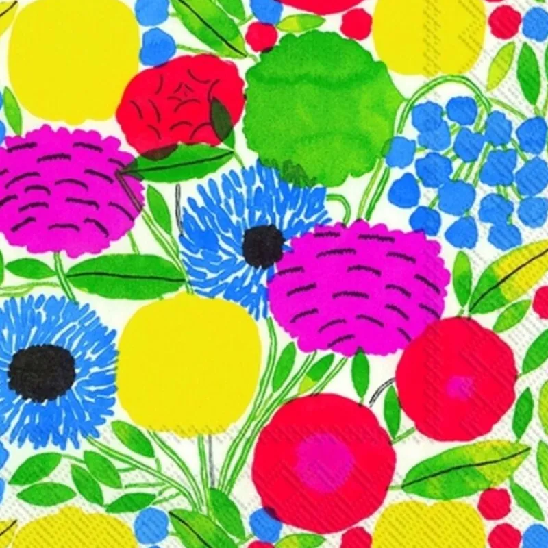 Die Lunch-Servietten Sitruunapuu pink mit Motiv von Marimekko sind 33 x 33 cm groß. Sie bestehen aus gefalztem, dreilagigem Tissuepapier. Ein Päckchen enthält 20 Servietten.