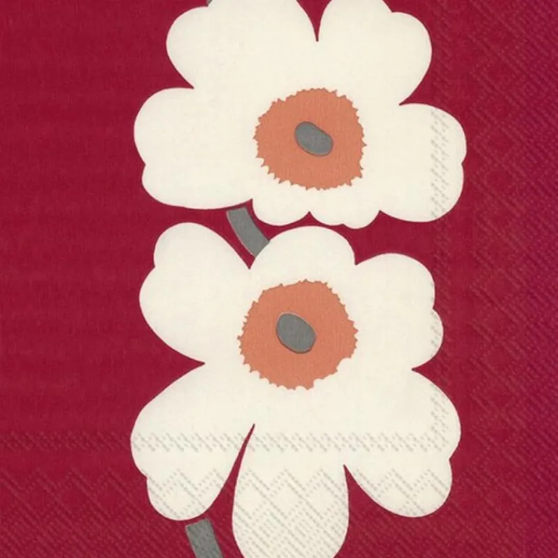 Die finnische Designfirma Marimekko wird weltweit für ihre bekannten, farbenfrohen Prints gefeiert. Gegründet wurde sie von Armi Ratia, die während der eher modisch eher restriktiven 50er-Jahre Kleider mit abstrakten und grafischen Mustern in lebensfrohen Farben entwarf. Der zeitlose und schöpferische Umgang mit Farbe und Formen verleiht Produkten von Marimekko eine starke und außergewöhnliche Identität. Die Entwürfe mit der einzigartigen Designsprache werden heute auch auf Accessoires und Dekorationsartikeln gedruckt, unter anderem auf Papierservietten.