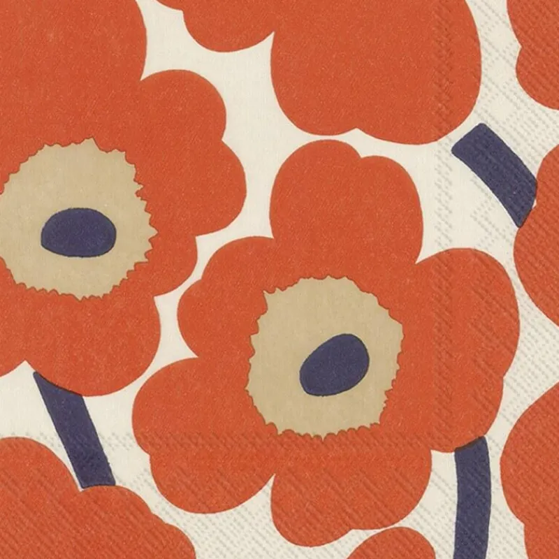 Die finnische Designfirma Marimekko wird weltweit für ihre bekannten, farbenfrohen Prints gefeiert. Gegründet wurde sie von Armi Ratia, die während der eher modisch eher restriktiven 50er-Jahre Kleider mit abstrakten und grafischen Mustern in lebensfrohen Farben entwarf. Der zeitlose und schöpferische Umgang mit Farbe und Formen verleiht Produkten von Marimekko eine starke und außergewöhnliche Identität. Die Entwürfe mit der einzigartigen Designsprache werden heute auch auf Accessoires und Dekorationsartikeln gedruckt, unter anderem auf Papierservietten.