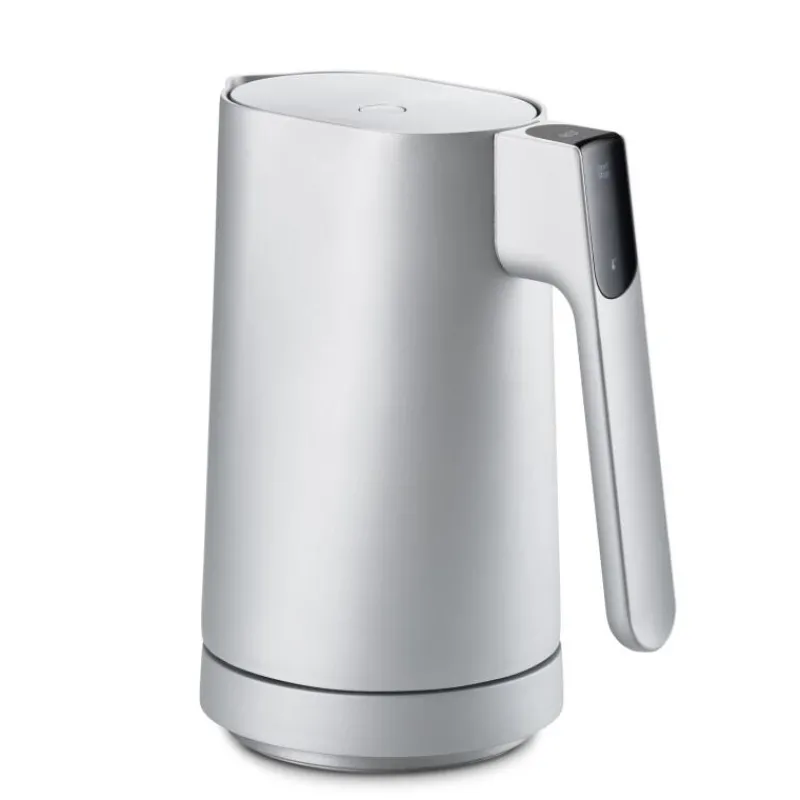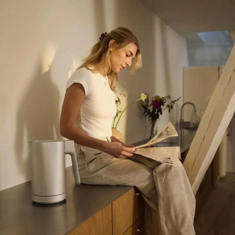 Der elektrische Wasserkocher von Jacob Jensen überzeugt mit soliden Materialien und einer ruhigen Eleganz. Er verfügt über eine intelligente Benutzeraberfläche, die zum Leben erwacht, sobald man sich ihr nähert und von alleine wieder ausgeht, wenn sie ncht mehr benötigt wird. Über das Display kann aus sieben voreingestellten Temperaturstufen zwischen 70°C und 100°C ausgewählt werden, dabei wird die aktuelle Wassertemperatur stets angezeigt und kann so überwacht werden. Ein sanfter Piepton signalisiert, wenn das Wasser die gewünschte Temperatur erreicht hat. Zusätzlich sorgt eine Warmhaltefunktion dafür, dass Ihr Wasser die ausgewählte Temperatur beibehält, bis der Wasserkocher von der Basis entfernt wird. Der elektrische Wasserkocher besteht aus Edelstahl und Aluminium, er ist 23 cm hoch und inklusive des Griffes 23 cm breit. Die Basis hat einen Durchmesser von 15,5 cm. Das Volumen des Wasserkochers beträgt 1200 ml.