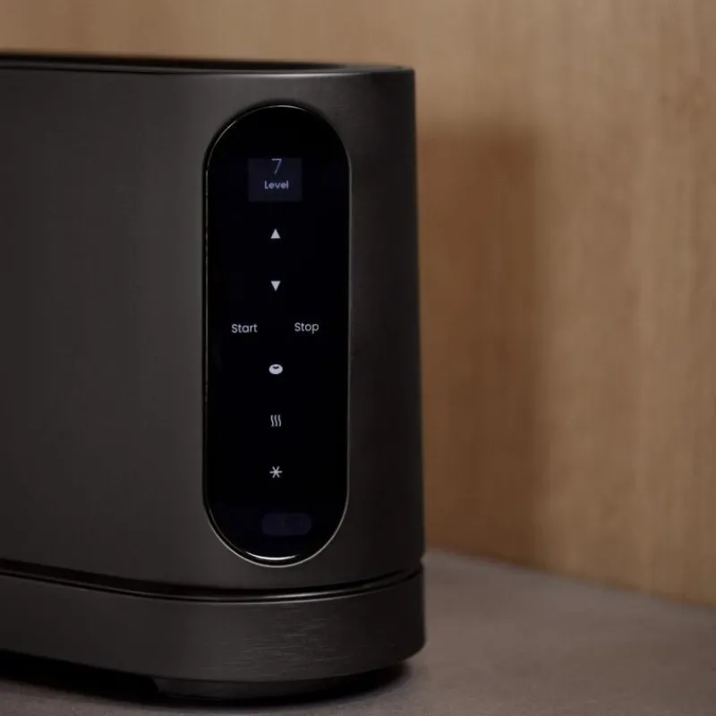 Der Long Slot Toaster von Jacob Jensen überzeugt mit soliden Materialien und einer ruhigen Eleganz. Ein besonderes Augenmerk wurde darauf gelegt, dass er möglichst leise funktioniert, um eine entspannte Morgen-Routine zu schaffen. Dafürwurde ein Soft-Lift-Mechanismus entwickelt, der das Brot auf Knopfdruck langsam in und aus dem Toaster führt. Der Toaster verfügt über eine intelligente Benutzeraberfläche, die zum Leben erwacht, sobald man sich ihr nähert und von alleine wieder ausgeht, wenn sie ncht mehr benötigt wird. Über das Display kann aus sieben Bräunungsstufen ausgewählt werden, der Toaster bietet außerdem eine Bagel-Funktion, bei der nur auf einer Seite getoastet wird, ein Auftau-Programm, um gefrorenes Brot vor dem Toasten aufzutauen sowie eine Aufwärmfunktion. Der Langschlitztoaster besteht sowohl außen als auch innen aus Edelstahl, er ist 41 cm lang, 11 cm breit und 19,5 cm hoch. Der Toast-Schlitz ist 26 cm lang.