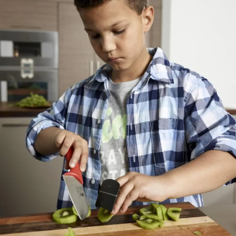 Das Junior Kochmesser von Kai wurde speziell für Kinder ab 6 Jahren entwickelt, um ihnen einen sicheren und verantwortungsvollen Umgang mit Messern beim gemeinsamen Kochen zu ermöglichen. Das ergonomisch gestaltete Messer erleichtert den Einstieg in die Welt des Kochens und fördert die motorischen Fähigkeiten der Kleinen. Die hochwertige Edelstahlklinge ist mit einem feinen Wellenschliff versehen, der eine intuitive Schneidetechnik imitiert und den Kraftaufwand sowie das Risiko des Abrutschens minimiert. Zusätzlich trägt die abgerundete, stumpfe Spitze zur Verringerung des Verletzungsrisikos bei. Um die Sicherheit weiter zu gewährleisten, sind ein Fingerprotektor und eine praktische Messertasche im Lieferumfang enthalten, die eine sichere Aufbewahrung ermöglichen. Der rutschfeste Kunststoffgriff sorgt dafür, dass das Junior Kochmesser sicher in kleinen Händen liegt und bietet zusätzlichen Komfort beim Schneiden.