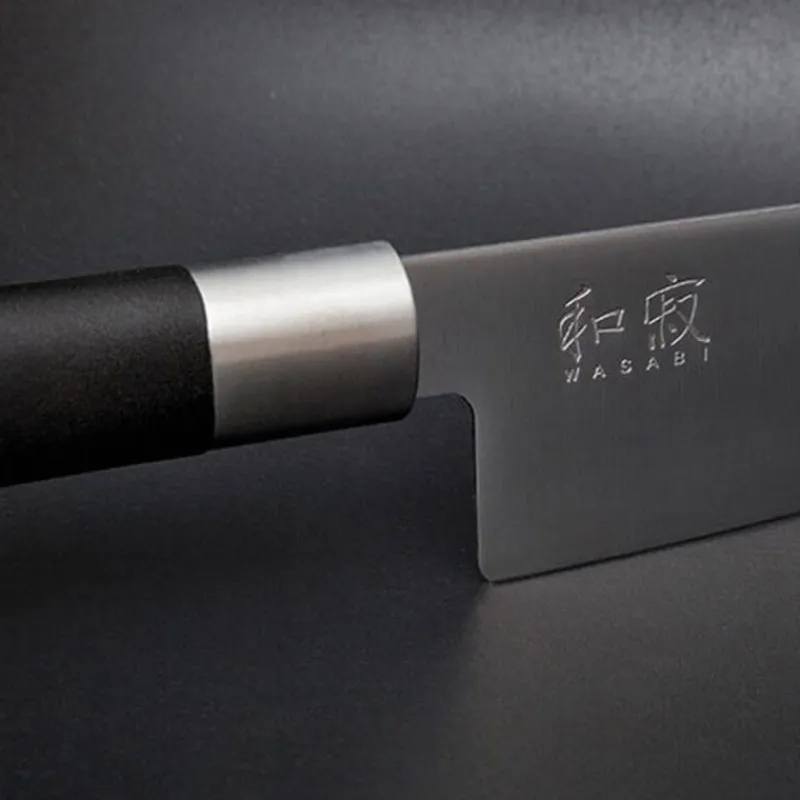 Die Kollektion Wasabi Black zeichnet sich durch eine gelungene Kombination aus beständiger Funktionalität und Schärfe, robuster Material-Qualität und reduziertem Design aus. Die Serie hat ihren Ursprung in der japanischen Großküche und ist somit für einen unkomplizierten Dauereinsatz geeignet. Durch den wasserbeständigen Kunststoffgriff sind die einseitig bzw. beidseitig geschliffenen Messer einfach zu pflegen und weisen eine angenehme Haptik auf, welche durch den Zusatz von Bambsupuder zurückzuführen ist.