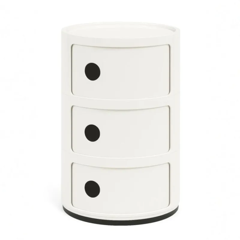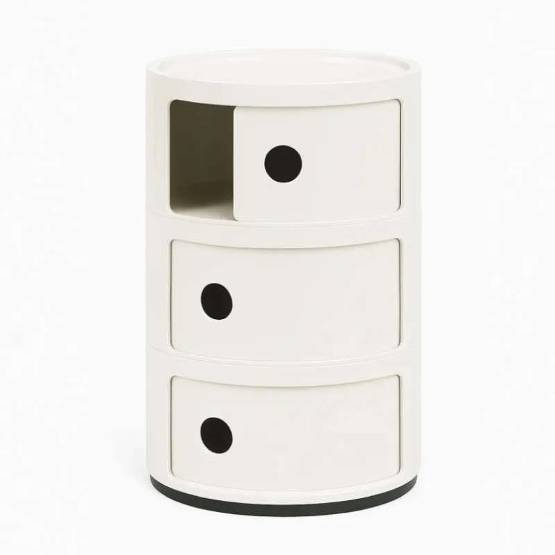 Die Kartell Componibili-Serie, entworfen von der renommierten Designerin Anna Castelli Ferrieri, stellt ein harmonisches Zusammenspiel aus Funktionalität und ästhetischem Design dar. Diese modulare Möbelserie überzeugt durch ihre zeitlose Eleganz und vielseitigen Anwendungsmöglichkeiten. Die Componibili-Elemente sind in verschiedenen Ausführungen und Farben erhältlich, was ihnen die Anpassungsfähigkeit an diverse Einrichtungsstile verleiht. Gefertigt aus hochwertigem, recyclebarem Kunststoff, bietet das Produkt nicht nur einen umweltfreundlichen Ansatz, sondern ist zudem äußerst pflegeleicht und widerstandsfähig. Die runden, stapelbaren Elemente sind mit Schiebetüren ausgestattet, die einen schnellen Zugriff auf Inhalte ermöglichen – ideal für den Einsatz im Wohnzimmer, Schlafzimmer oder Badezimmer. Die Componibili-Serie ist mehr als nur ein praktisches Aufbewahrungssystem; sie ist ein Statement modernen Designs. Durch ihre hohe Funktionalität sowie ihr ansprechendes Erscheinungsbild hat sich die Kommode zu einem wahren Klassiker im Bereich des Interior Designs entwickelt. Der Container besteht aus durchgefärbtem ABS-Kunststoff, in der Variante mit drei Fächern ist er 58,5 cm hoch und hat einen Durchmesser von 32 cm.