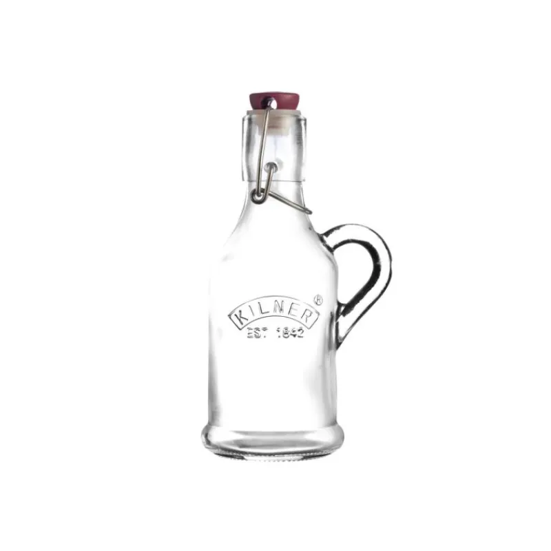 Die Kilner Glasflasche mit Bügelverschluss ist perfekt zum Aufbewahren von Ölen, Essig oder Dressings geeignet. Der Bügelverschluss mit Silikondichtung sorgt für lang anhaltende Frische der Lebensmittel. Die Flasche verfügt über einen Henkel zum einfachen Ausgießen der Flüssigkeiten. Auch selbst hergestellte Saucen oder andere Spezialitäten sind bestens in der Flasche aufgehoben. Die Glasflasche hat ein Volumen von 200 ml und ist 17,5 cm hoch.