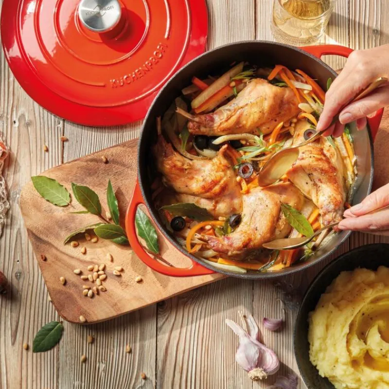 Allein der Name Provence der Kochgeschirr-Kollektion von Küchenprofi lässt das Wasser im Mund zusammenlaufen: frisches Gemüse, Lammfleisch oder Meeresfrüchte, die südfranzösische Küche ist vielseitig und gesund. Die Töpfe der Serie Provence sind ideal dafür geeignet, Gerichte zu kochen, braten, schmoren oder zu frittieren, ganz auf die französische Art. Sie bestehen aus Gusseisen und sich mit einer robusten Emaille versehen, so wird die Hitze im Topf optimal verteilt und Wärme gespeichert. Das macht sie energieeffzient, was die Umwelt schont und die Aromen der verarbeiteten Lebensmittel erhält. Zudem sind die Töpfe durch den handlichen Knopf sowie die ergonomischen Griffe einfach in der Handhabung und sehr pflegeleicht: sie können in der Spülmaschine gereinigt werden. Der Bratentopf ist für alle Herdarten inklusive Induktion sowie für Grillgeräte geeignet, der Deckelknopf aus Edelstahl ist bis zu 250°C ofenfest. Mit einem Volumen von 4,2 Litern und einem Durchmesser von 24 cm lässt der Bratentopf Provence keine Wünsche offen.