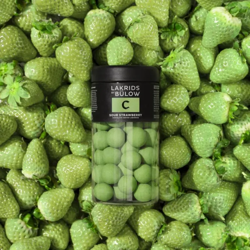 Frische und säuerliche Noten der Erdbeere treffen bei der Sorte Sour Strawberry auf exquisite, rote Lakritze. Die Ummantelung mit weißer Schokolade und der knusprigen, grünen Zuckerhülle sorgen für eine extra-saure Note. Glutenfrei, 125 g.