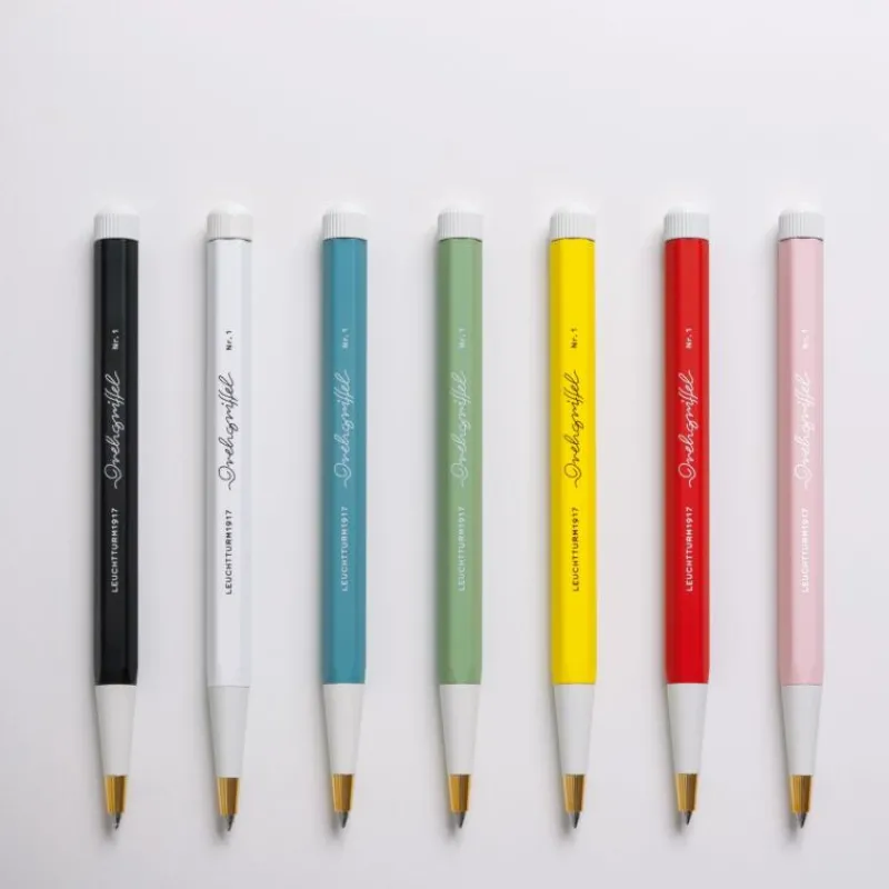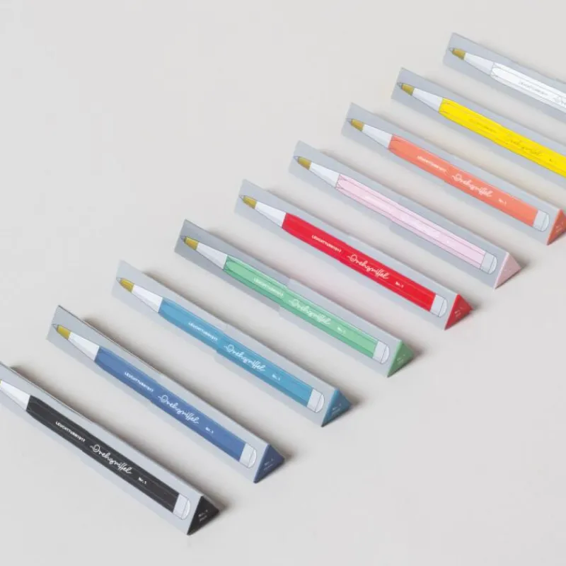 Der Drehgriffel Nr. 1 ist kein Stift, sondern viel mehr als das. Das von den 1920-er Jahren inspirierte qualitativ hochwertige Schreibgerät ist ein mehrfach prämiertes Statement. Der Drehgriffel Nr. 1 weist eine sechseckige Silhouette auf und die schmal zulaufende Spitze, setzt sich, ebenso wie der Drehkopf farblich ab. Das Schreibgerät liegt, auch aufgrund seines geringen Gewichtes, angenehm in der Hand und ist in zahlreichen Farben der breiten Farbpalette des beliebten und renommierten Herstellers erhältlich. Die fein gelagerte Drehmechanik, die aus Aluminium und Messing hergestellt wird, wird, ebenso wie die Mine, in Deutschland gefertigt. Das Schreibgerät wird anschließend lackiert und versiegelt. Geliefert wird der Drehgriffel Nr. 1 mit einer Mine in dokumentenechtem Königsblau in Stärke M. Ersatzminen sind in den Farben Königsblau, Grün, Rot und Schwarz erhältlich. In Kombination mit dem Pen Loop bilden der Drehgriffel und das Notizbuch ein abgestimmtes Trio für das perfekte Schreiberlebnis. Der Drehgriffel Nr. 1 ist 13 cm lang.