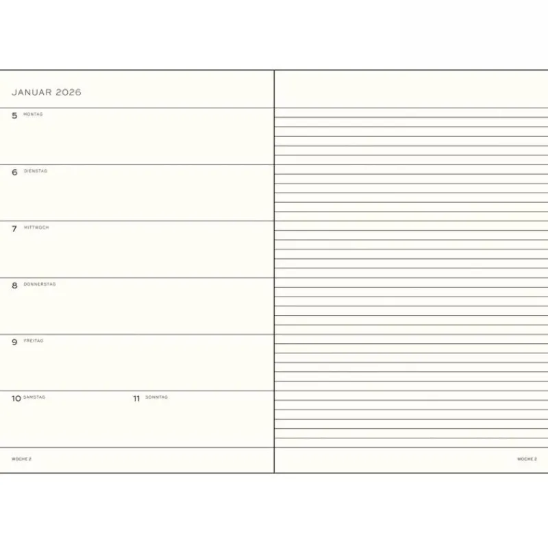 Der beliebte Wochenkalender von Leuchtturm1917 bietet auf der jeweils linken Seite eine praktische Übersicht über die Wochentage, rechts gibt die linierte Aufteilung Struktur und lässt gleichzeitig Freiheit für eine individuelle Nutzung. Die Lineatur vereinfacht das Erstellen von Listen und ermöglicht so eine einfache Organisation und Planung. Zusätzlich verfügt der Kalender über weitere, nützliche Eigenschaften und Funktionen: eine Kalenderübersicht deckt die Jahre 2025, 2026 und 2027 ab, ein tabellarischer Projektplaner und die praktische Falttasche für Dokumente, Tickets oder Quittungen runden die perfekte Ausstattung ab. Der Kalender in der Größe Master hat das Format A4+ und ist mit einem Hardcover ausgestattet.