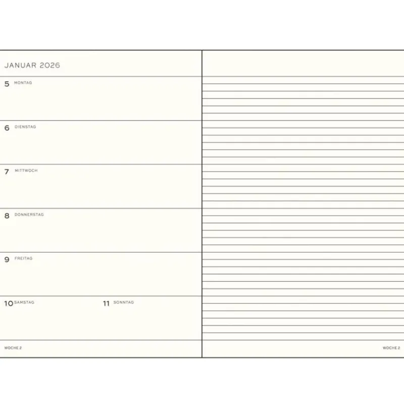 Der beliebte Wochenkalender von Leuchtturm1917 bietet auf der jeweils linken Seite eine praktische Übersicht über die Wochentage, rechts gibt die linierte Aufteilung Struktur und lässt gleichzeitig Freiheit für eine individuelle Nutzung. Die Lineatur vereinfacht das erstellen von Listen und ermöglicht so eine einfache Organisation und Planung. Zusätzlich verfügt der Kalender über weitere, nützliche Eigenschaften und Funktionen: eine Kalenderübersicht deckt die Jahre 2025, 2026 und 2027 ab, ein tabellarischer Projektplaner und die praktische Falttasche für Dokumente, Tickets oder Quittungen runden die perfekte Ausstattung ab. Der Kalender in der Größe Medium hat das Format A5 und ist mit einem Hardcover ausgestattet.