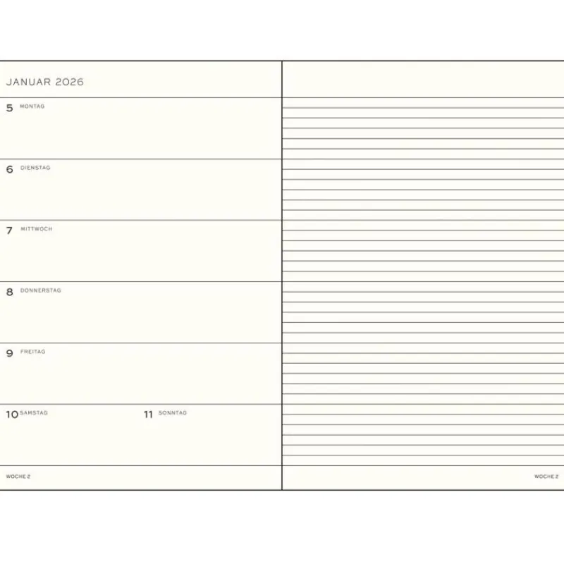 Der beliebte Wochenkalender von Leuchtturm1917 bietet auf der jeweils linken Seite eine praktische Übersicht über die Wochentage, rechts gibt die linierte Aufteilung Struktur und lässt gleichzeitig Freiheit für eine individuelle Nutzung. Die Lineatur vereinfacht das erstellen von Listen und ermöglicht so eine einfache Organisation und Planung. Zusätzlich verfügt der Kalender über weitere, nützliche Eigenschaften und Funktionen: eine Kalenderübersicht deckt die Jahre 2025, 2026 und 2027 ab, ein tabellarischer Projektplaner und die praktische Falttasche für Dokumente, Tickets oder Quittungen runden die perfekte Ausstattung ab. Der Kalender in der Größe Medium hat das Format A5 und ist mit einem Hardcover ausgestattet.