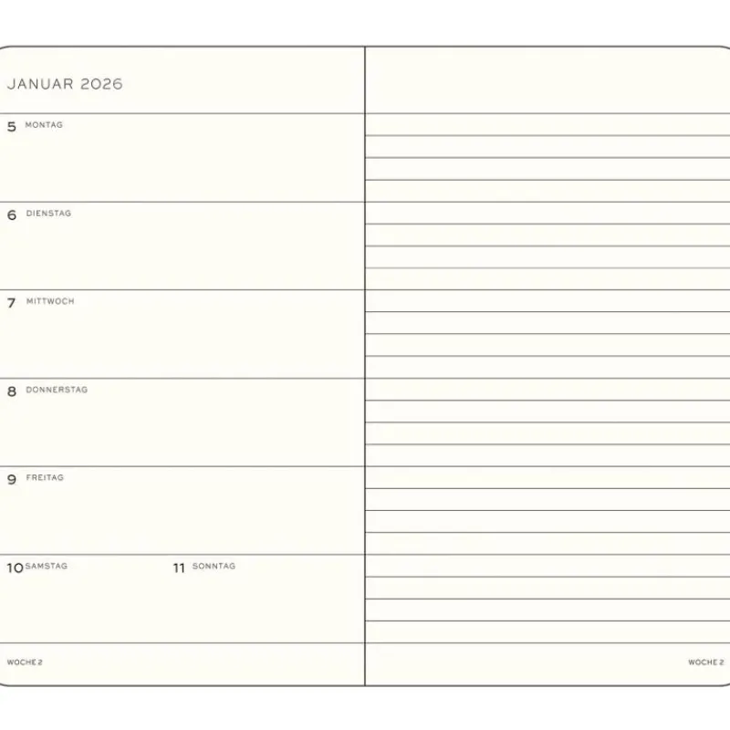 Der beliebte Wochenkalender von Leuchtturm1917 bietet auf der jeweils linken Seite eine praktische Übersicht über die Wochentage, rechts gibt die linierte Aufteilung Struktur und lässt gleichzeitig Freiheit für eine individuelle Nutzung. Die Lineatur vereinfacht das Erstellen von Listen und ermöglicht so eine einfache Organisation und Planung. Zusätzlich verfügt der Kalender über weitere, nützliche Eigenschaften und Funktionen: eine Kalenderübersicht deckt die Jahre 2025, 2026 und 2027 ab, ein tabellarischer Projektplaner und die praktische Falttasche für Dokumente, Tickets oder Quittungen runden die perfekte Ausstattung ab. Der Kalender in der Größe Pokcet hat das Format A6 und ist mit einem Hardcover ausgestattet.
