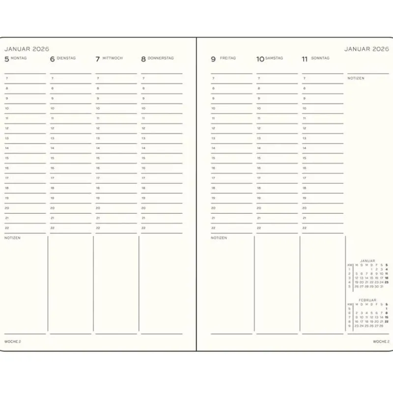 Der beliebte Wochenkalender von Leuchtturm1917 ermöglicht eine praktische Übersicht über die Woche, denn die jeweiligen Tage erstrecken sch in Spalten über eine Doppelseite. Jeder Zeile ist dabei eine Stunde zugeordnet (7-22 Uhr). So wird eine detaillierte Tagesplanung und eine gute Übersicht über die Woche ermöglicht. Zusätzlich verfügt der Kalender über weitere, nützliche Eigenschaften und Funktionen: eine Kalenderübersicht deckt die Jahre 2025, 2026 und 2027 ab, ein tabellarischer Projektplaner und die praktische Falttasche für Dokumente, Tickets oder Quittungen runden die perfekte Ausstattung ab. Der Kalender in der Größe Composition hat das Format B5 und ist mit einem Hardcover ausgestattet.