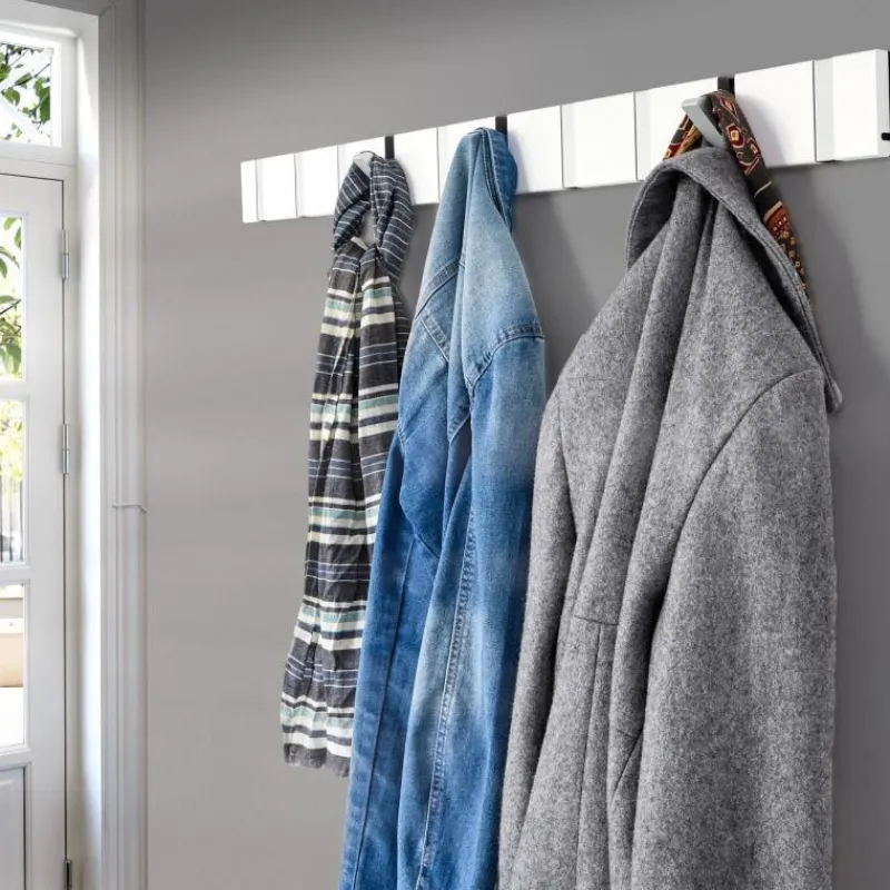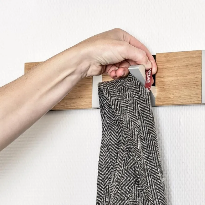 Immer da, wenn man sie braucht: die Garderobenleiste Knax wurde vom Designstudio Harrit & Sørensen für LoCa entworfen und ist die wahrscheinlich flachste Garderobe der Welt. Bei Nichtbenutzung bleiben die einzelnen Haken aus Aluminium durch eine kleine Spannfeder eingeklappt, so ist die Garderobe nur 1,8 cm tief. Erst bei Bedarf lassen sich die Haken ausklappen und haben dann eine Tragkraft von beeindruckenden 25 kg pro Haken. Die Vorderfront besteht aus geöltem Eichenholz, das in Dänemark in Handarbeit verarbeitet wird. Die Garderobenleiste wird ganz einfach mit der stabilen Metallseite nach hinten an der Wand montiert und garantiert sicheren Halt bei hoher Belastung. Die Knax Garderobenleiste mit zwei Haken ist 19,8 cm lang und 7,9 cm hoch.