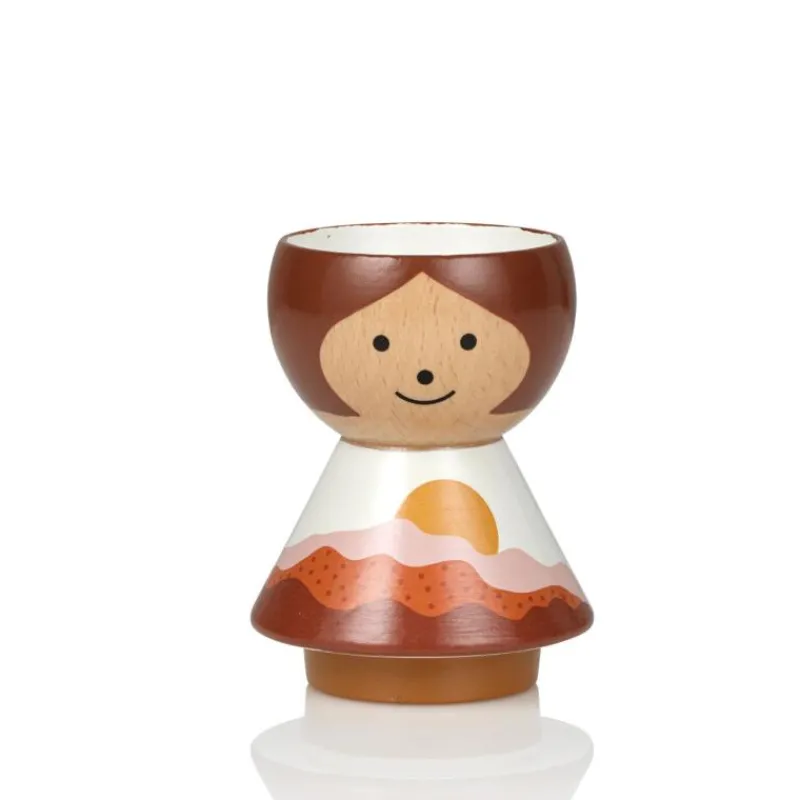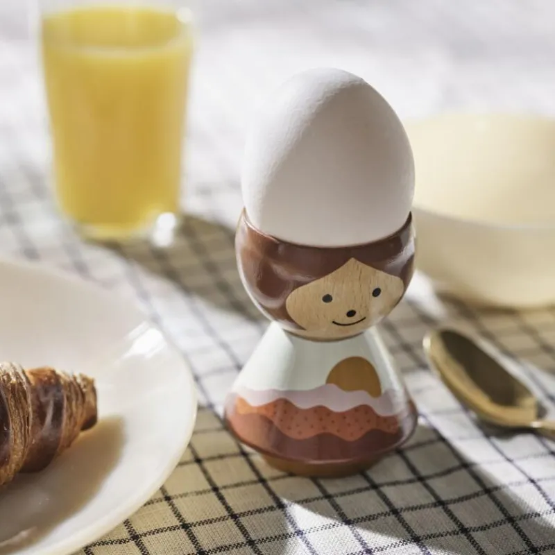 Die Serie Bordfolk von Lucie Kaas haucht einem Designliebling der 160er und 70er Jahre neues Leben ein. Die Kollektion lustiger Eierbecher ist eine Mischung aus ursprünglichem Design und modernen Ideen, die sich im Outfit der kleinen Becher widerspiegeln. Jeder Eierbecher hat einen ganz eigenen Charakter, der mit seinem einfach und bunten Design das Kind in uns anspricht. Das Mädchen im weißen Kleid mit Sonnenaufgang-Print ist sieben Zentimeter hoch und aus handbemaltem Buchenholz gefertigt. Der Eierbecher ist nicht für die Reinigung in der Spülmaschine geeignet.